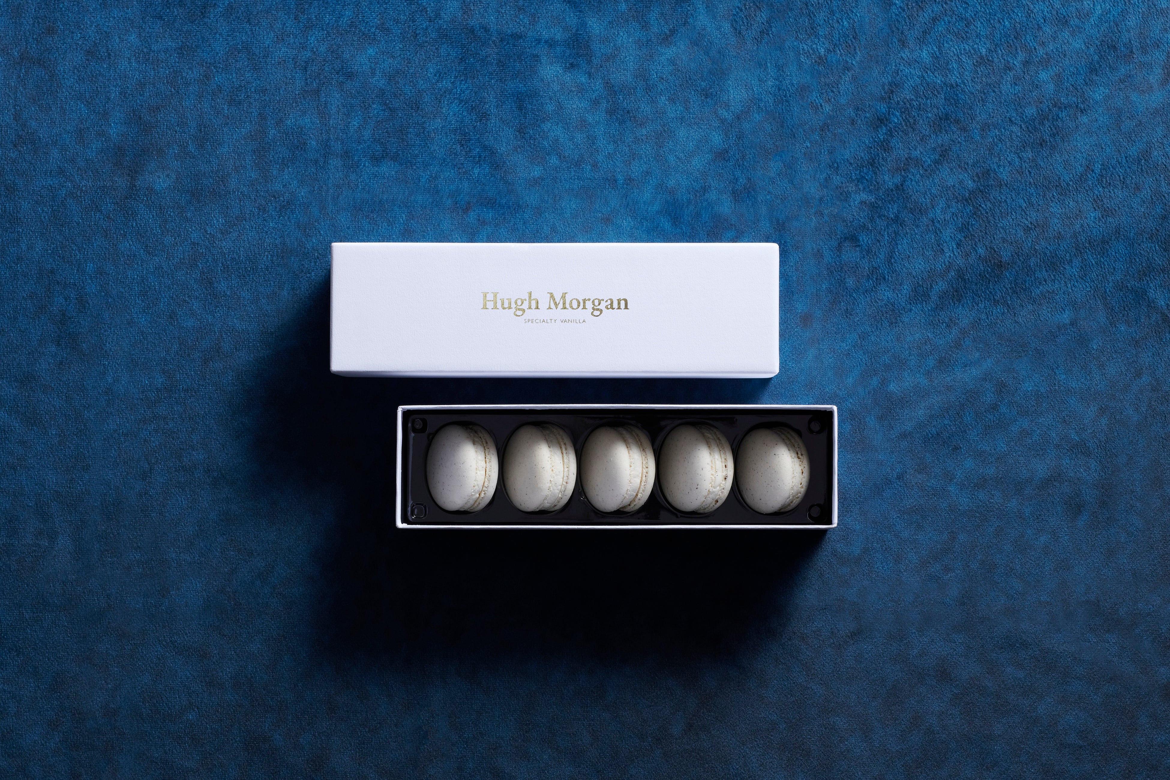 生地にも中のクリームにもバニラをたっぷり使用したHugh Morganのマカロン。中のクリームは軽めの仕上がりとなっており、 自家製のバニララムがふわっと香ります。外はサクっと、中はしっとりとした食感に、 バニラ&ラム酒の豊かな香りをお楽しみいただけます。