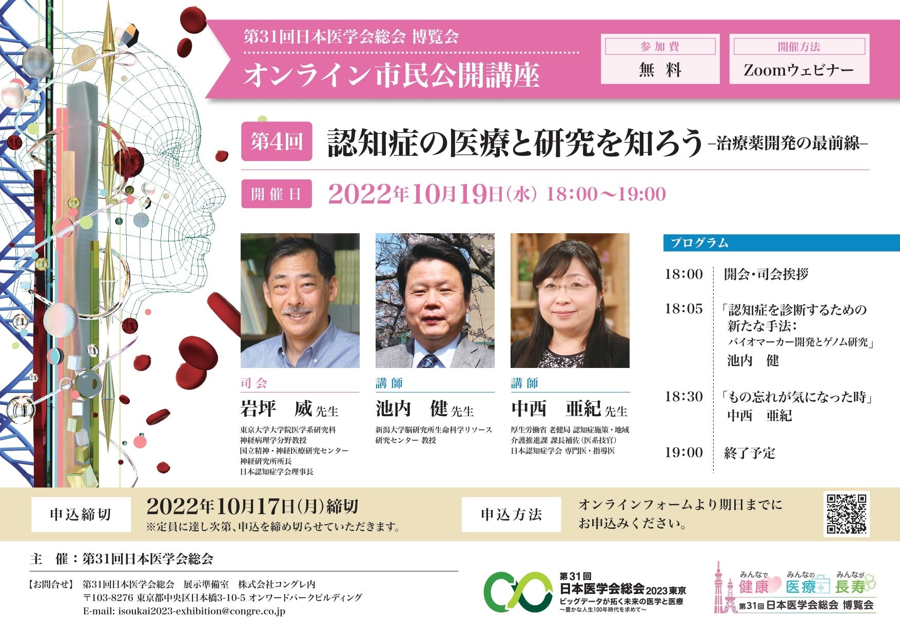 日本医学会総会 オンライン市民公開講座「認知症の医療と研究を知ろう-治療薬開発の最前線-」。「物忘れ」だけじゃない。認知症の「予兆」そして「予防」。