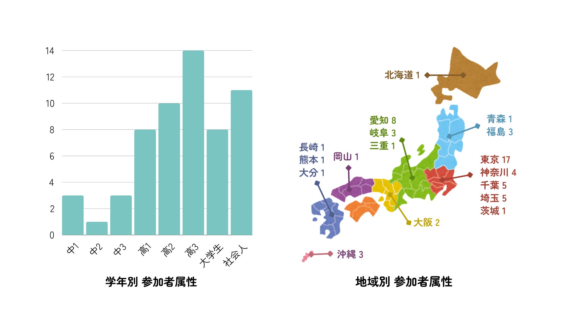 総勢58名(中学生7名、高校生32名、大学生・社会人19名)にご参加いただきました。オンライン開催時は特に全国各地から集まり、多様なバックグラウンドの方が一堂に会する場となりました。また、まちづくりにおける視点を増やし、議論を深まるため、大学生・社会人の方も募集しました。