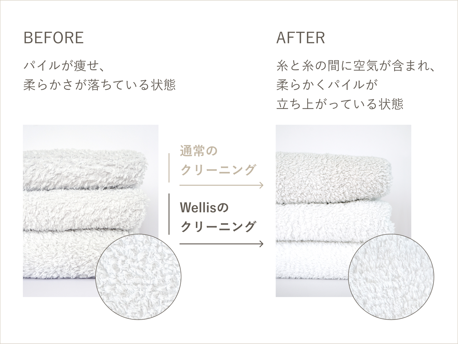 使い込んだタオルはパイルが寝てしまい、洗濯時に付着する汚れが蓄積され、肌心地が悪くなります。そのまま使い続けると、知らないうちにお肌を傷つけ肌荒れを引き起こす原因に繋がる可能性も。Wellisでは、肌心地の良い状態のタオルをできるだけ長く楽しんでいただくために、3ヶ月間使用したタオルを返送いただきクリーニングいたします。プロによる洗浄で、蓄積された汚れや繊維に残った洗剤や柔軟剤のカスを繊維の奥までしっかり洗い上げ、お肌に良い状態で長くご使用いただけます。