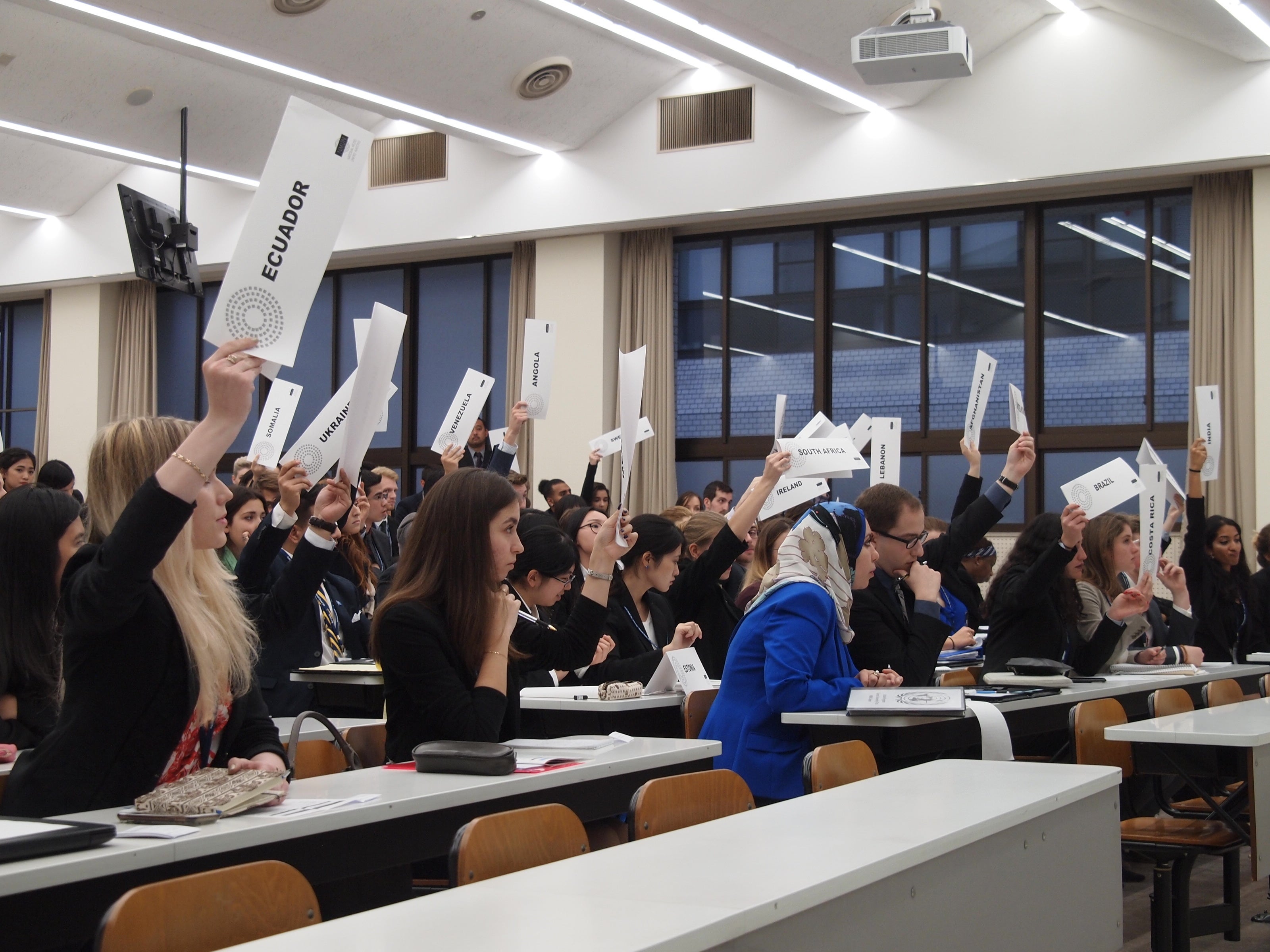 模擬国連とは、実際の国際連合での会議と同様に、参加者が各国代表団としての役割を担い、会議での議論を通じて国際問題への理解を深めるとともに、交渉力や議論の能力、語学力を含む総合的な国際コミュニケーション能力を高めることを目的とした教育活動です。