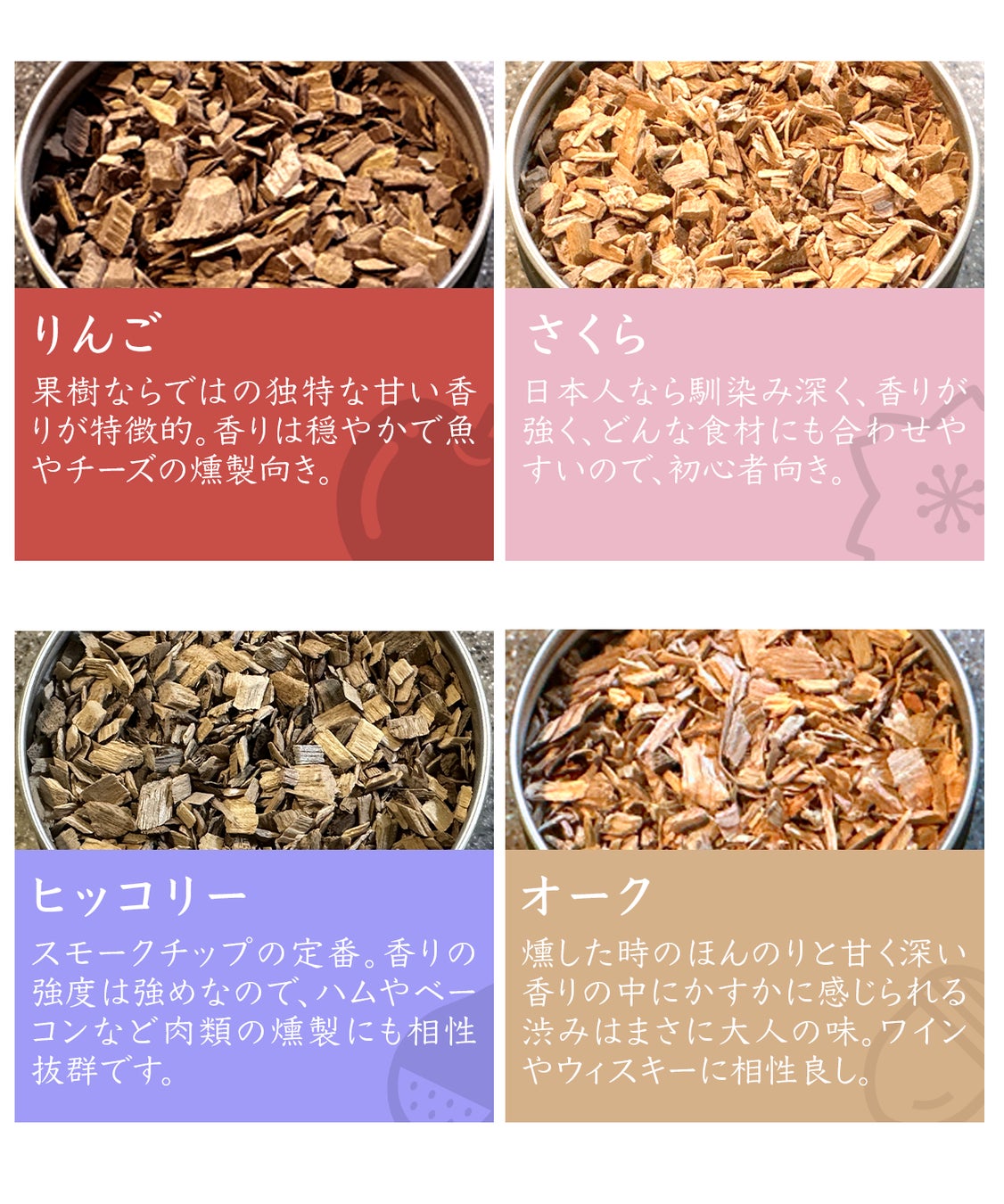 おすすめの木材チップが4種類付属しているので、燻製初心者におすすめ。