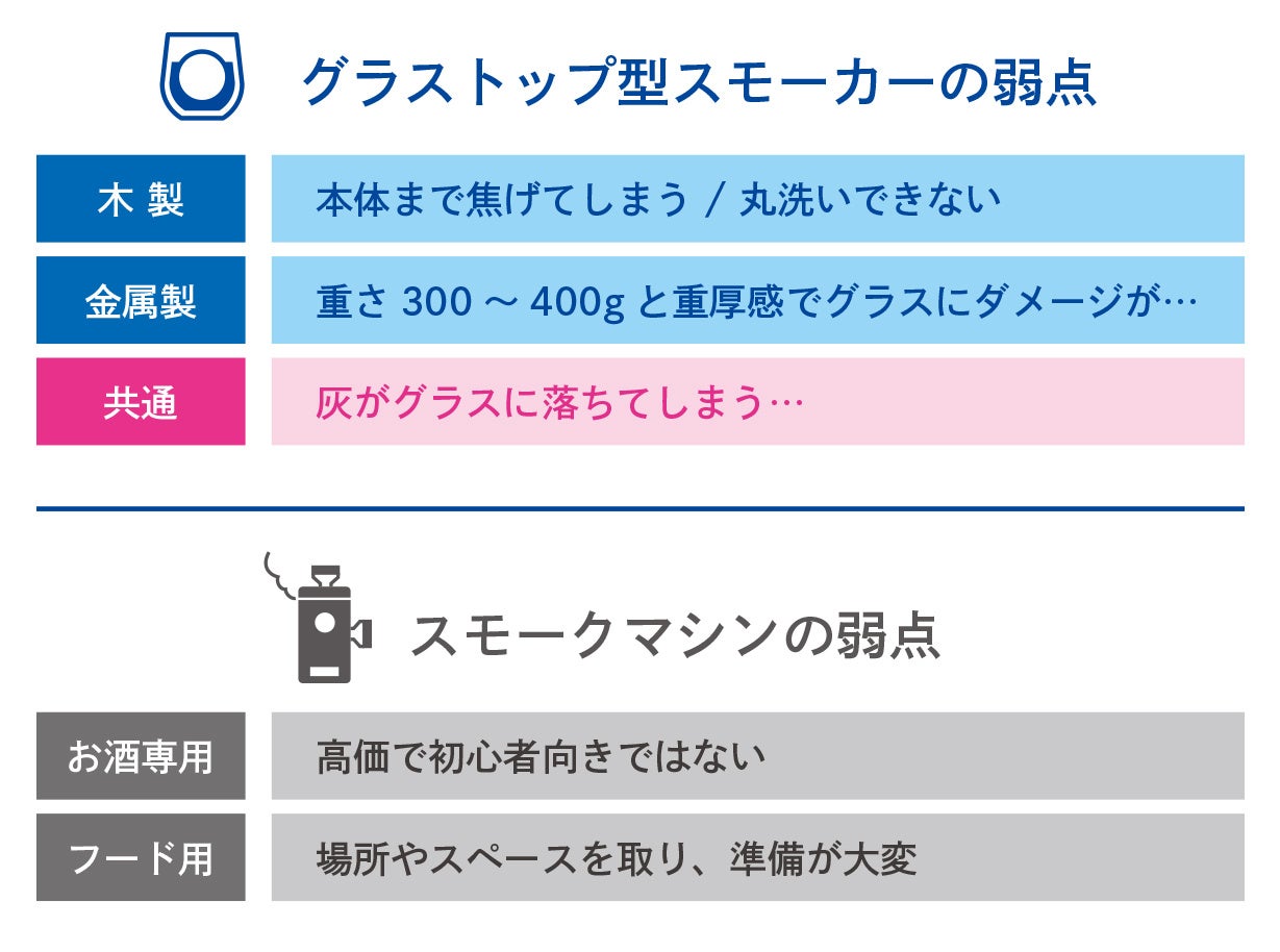 これまでのグラストップ型のスモーカーでは木製だと焦げ、丸洗いができなかったり、金属製だと300g~400gとなるため、重厚感からグラスにダメージが入りそう...とのお声がありました。