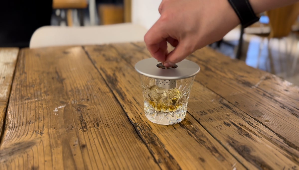 おうちのグラス上にスモーカーを置いて、木材チップを入れて、加熱するだけで本格的な燻製の香りを楽しめます。