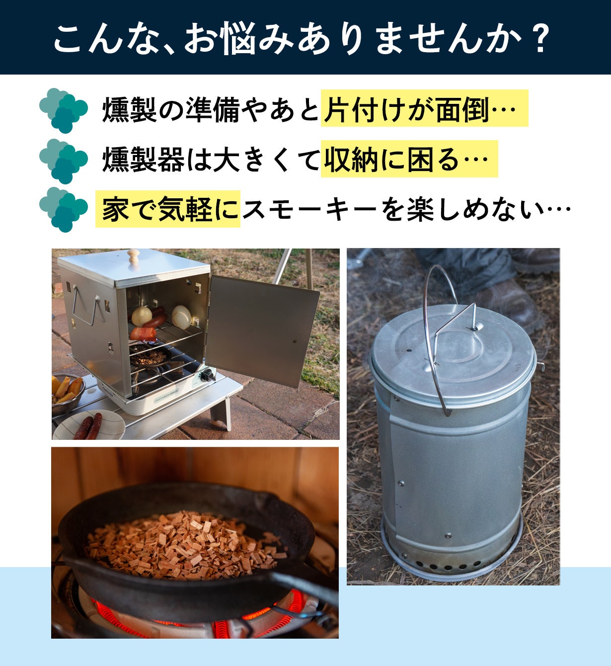 しかし、「燻製の準備やあと片付けが面倒…」「燻製器は大きくて収納に困る…」「家で気軽にスモーキーを楽しめない…」など、煩わしさを感じる方も多いのではないでしょうか。