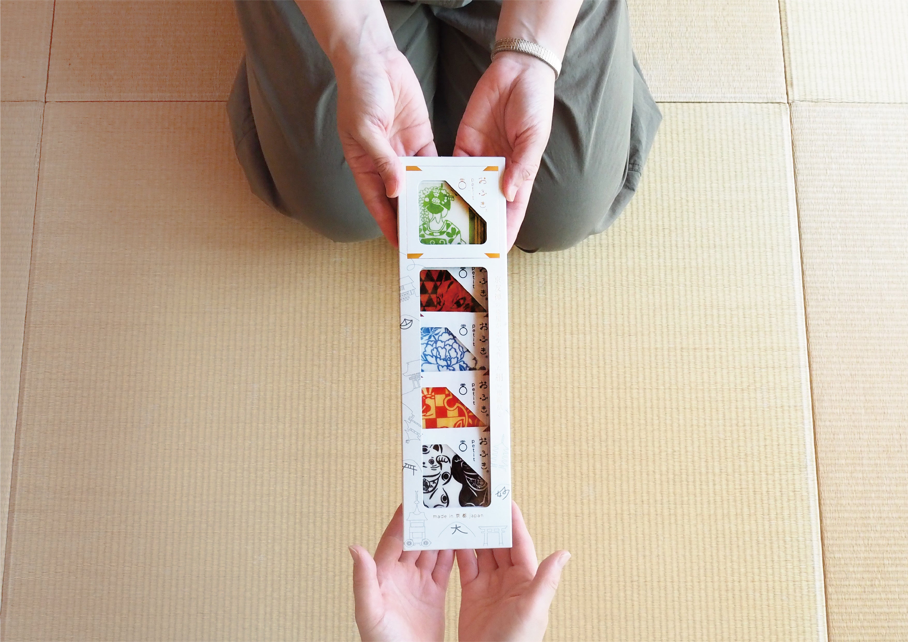 京都を訪れた方にお土産として旅の思い出をお裾分けしてもらえるよう、5枚をセットして箱に詰めました。