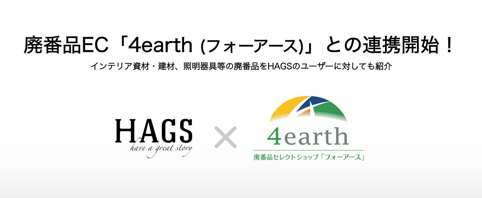 建材EC「HAGS」(https://www.hags-ec.com)は、本日、インテリア資材・建材、照明器具等の廃番品セレクトショップ「4earth (フォーアース) 」(以下フォーアース)と連携し、SDGsの達成やカーボンニュートラル社会の実現に貢献できる廃番品の活用・推進を開始することをお知らせ致します。建築工事において、CO2を抑制し、環境負荷の軽減に貢献できる建材/商材のニーズは日々高まってきています。この度、株式会社丹青社が運営するフォーアース ( https://4-earth.jp )と連携し、廃番品をHAGSのユーザーに対しても紹介していく試みを開始致します。