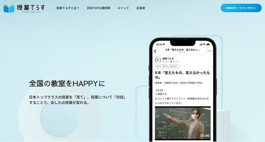 小学校の先生限定の授業力向上コミュニティ。日本トップクラスの授業技術をスマホ一つで学べて、全国の先生と授業について対話できる中庭(テラス)のような学び場。授業力を高め、先生が授業を楽しむことで全国の教室をHAPPYに照らします。