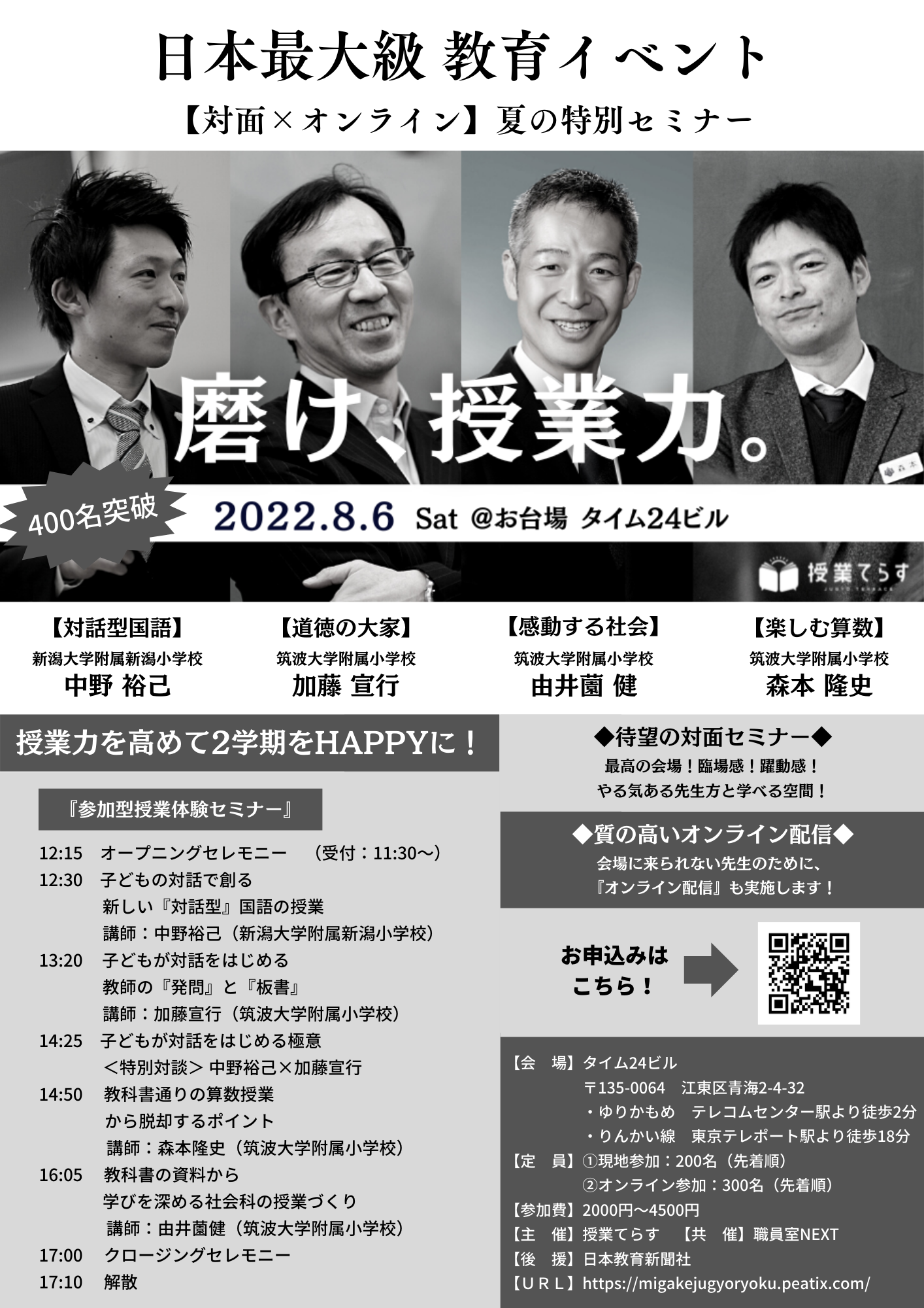 【400名突破】国内最大級・教員セミナー『磨け、授業⼒。』8月6日お台場で開催【全国47都道府県の先生が参加】