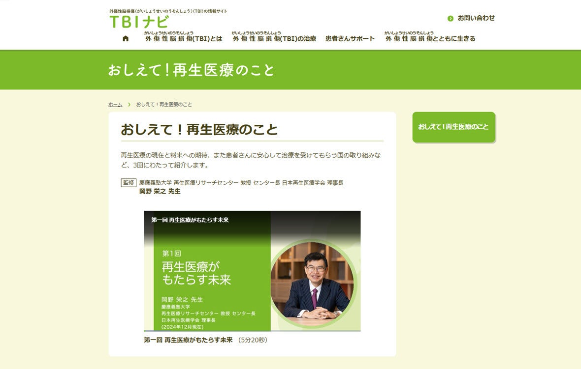 TBIナビ(R)は、サンバイオが運営する情報サイトで、外傷性脳損傷患者さん(当事者)やご家族の疾患や治療知識の向上支援や、再生医療、支援制度などの情報を中心に発信してまいります。この度、疾患啓発動画をシリーズ化し、第一弾として「教えて!再生医療のこと」を慶應義塾大学 再生医療リサーチセンター 教授 センター長、再生医療学会 理事長の岡野 栄之先生ご監修の元、3回に分けて再生医療について解説いただきます。