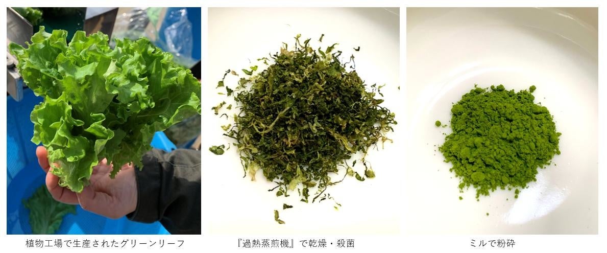『過熱蒸煎機』でレタス類を乾燥・殺菌すると、色鮮やかな緑色で、他の乾燥方法で起こる風味の変化が最小限に抑えられました。野菜ジュースに加えるとフレッシュな風味が付与されることがわかり、飲料メーカーと商品開発を進めています。
