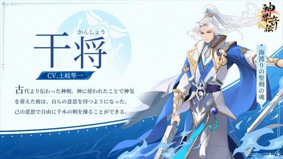 干将は,はるか古より中国から伝わってきた宝剣で、八百万神の戦争でスサノオが彼を手に入れ、主戦兵器として使っていた。長き月日が過ぎ、神気を蓄えた彼が自らの意思を持つようになった。剣の身である彼は無数の剣を召喚し、己の意思で剣の鋭さと向きを制御して精確な攻撃ができる。名実相伴う剣の神だ。