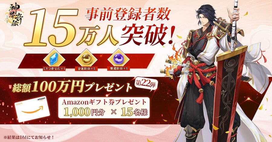 『神界奇伝~八百万神の幻想譚~』は配信に先駆けて、8人のキャラクターの魅力をアピールするプロモーションムービーを、事前登録キャンペーンとともに公開しました。現在、本作の事前登録者数は既に15万人を突破しました。App Store、Google Playのほか、Twitter、LINE、メールアドレスでの事前登録が可能です。登録者数に応じて、豪華ゲーム内報酬を全員プレゼントのほか、Amazonギフト券がもらえるTwitter抽選キャンペーンも開催中です。