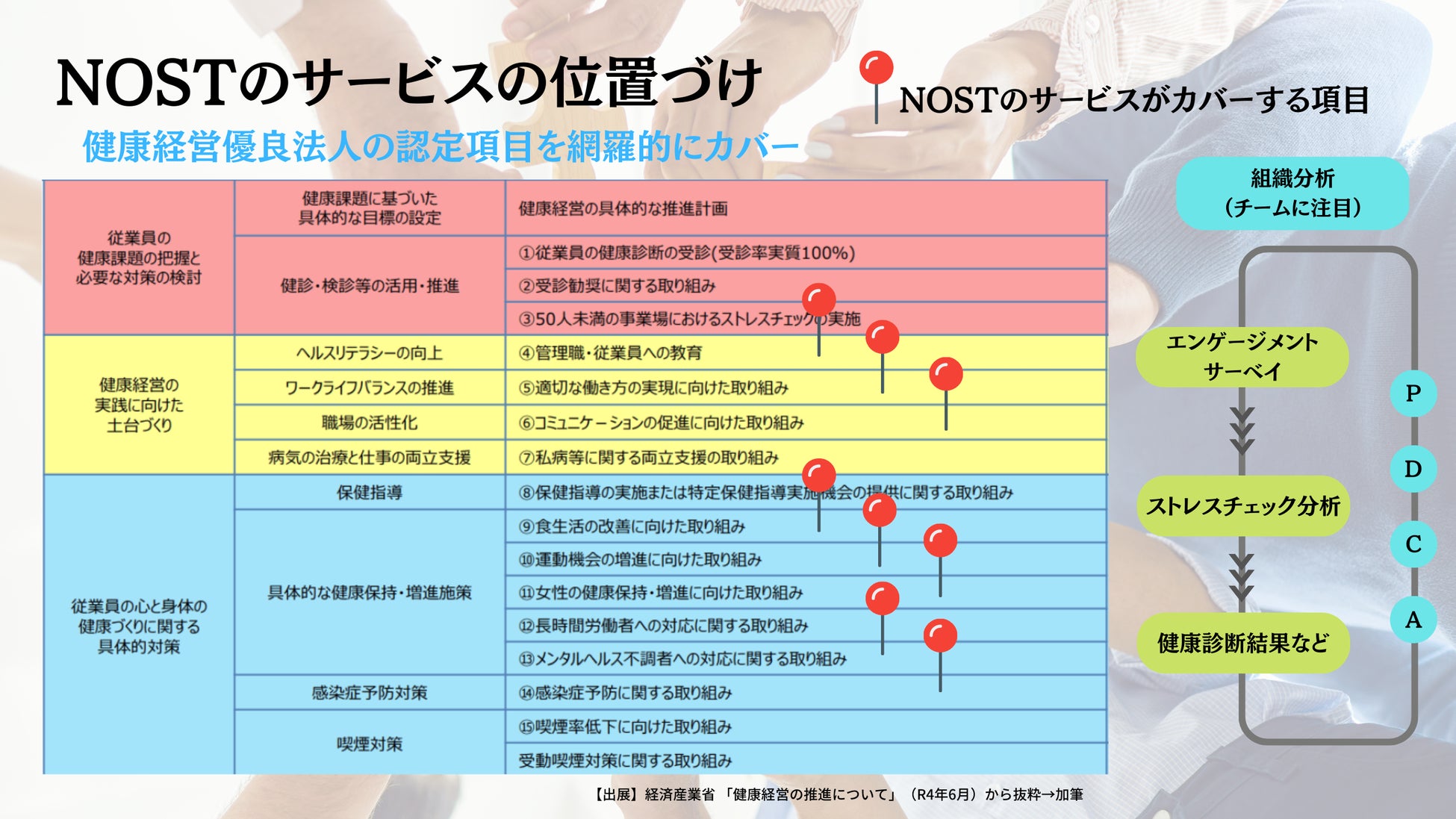 NOSTが提供するサービスは、健康経営優良法人の認定項目を包括的にカバーしているため、横断的な健康経営コンサルティングを展開することができます。