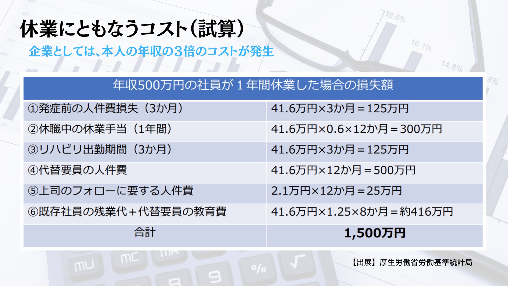 うつ病になると、休業期間は約3ヶ月、パフォーマンス回復期間は約1年かかる(*4)といわれています。また、従業員が休職した場合のコストは、本人の年収の3倍というデータもあります。(*4:WE Broadhead's researchより)