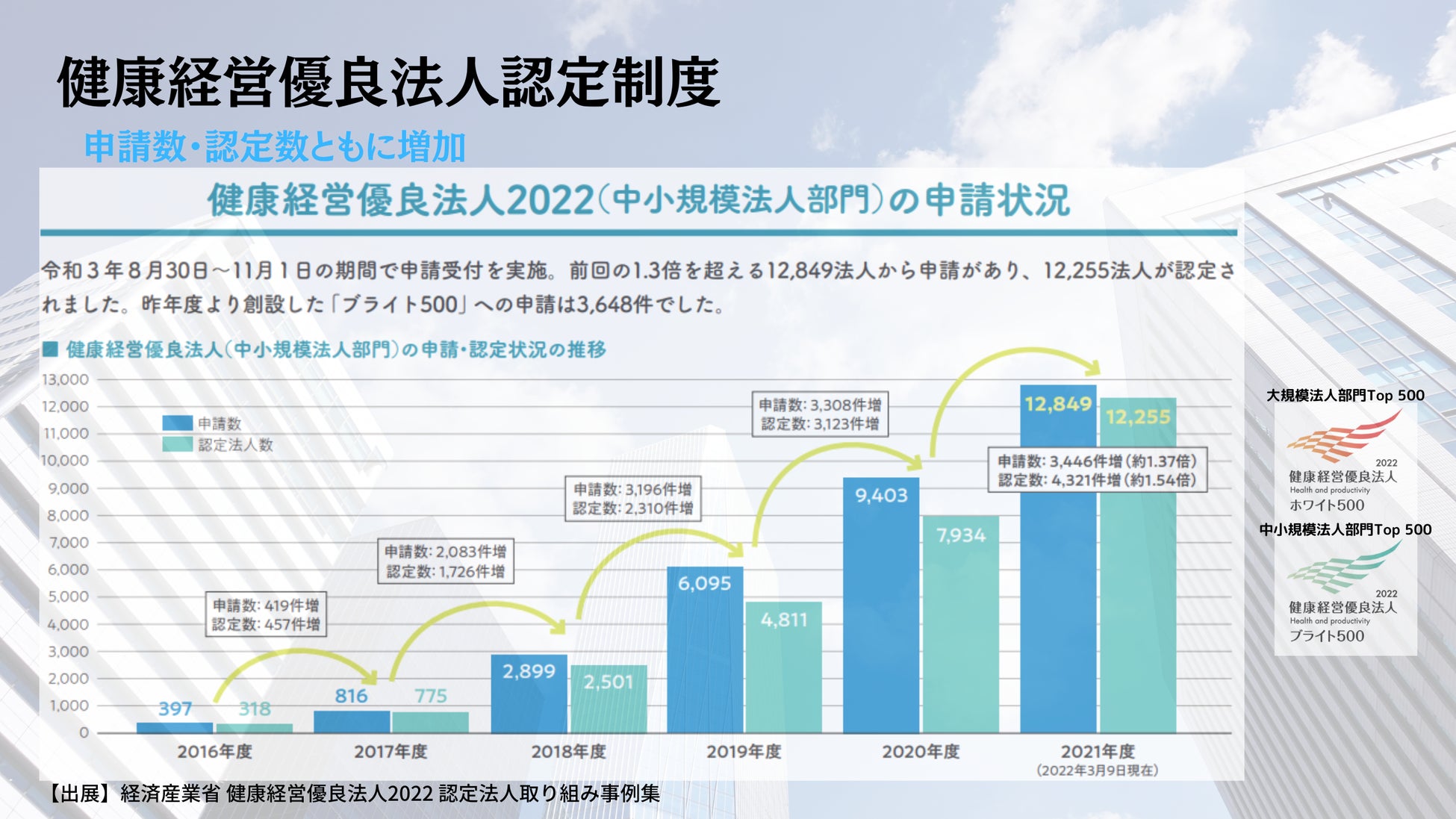 こうした環境の中で、経済産業省が「健康経営優良法人認定」を広めたことで、「健康経営」というキーワードが一気に広まり、認定基準に沿った申請の動きが年々増加しています。