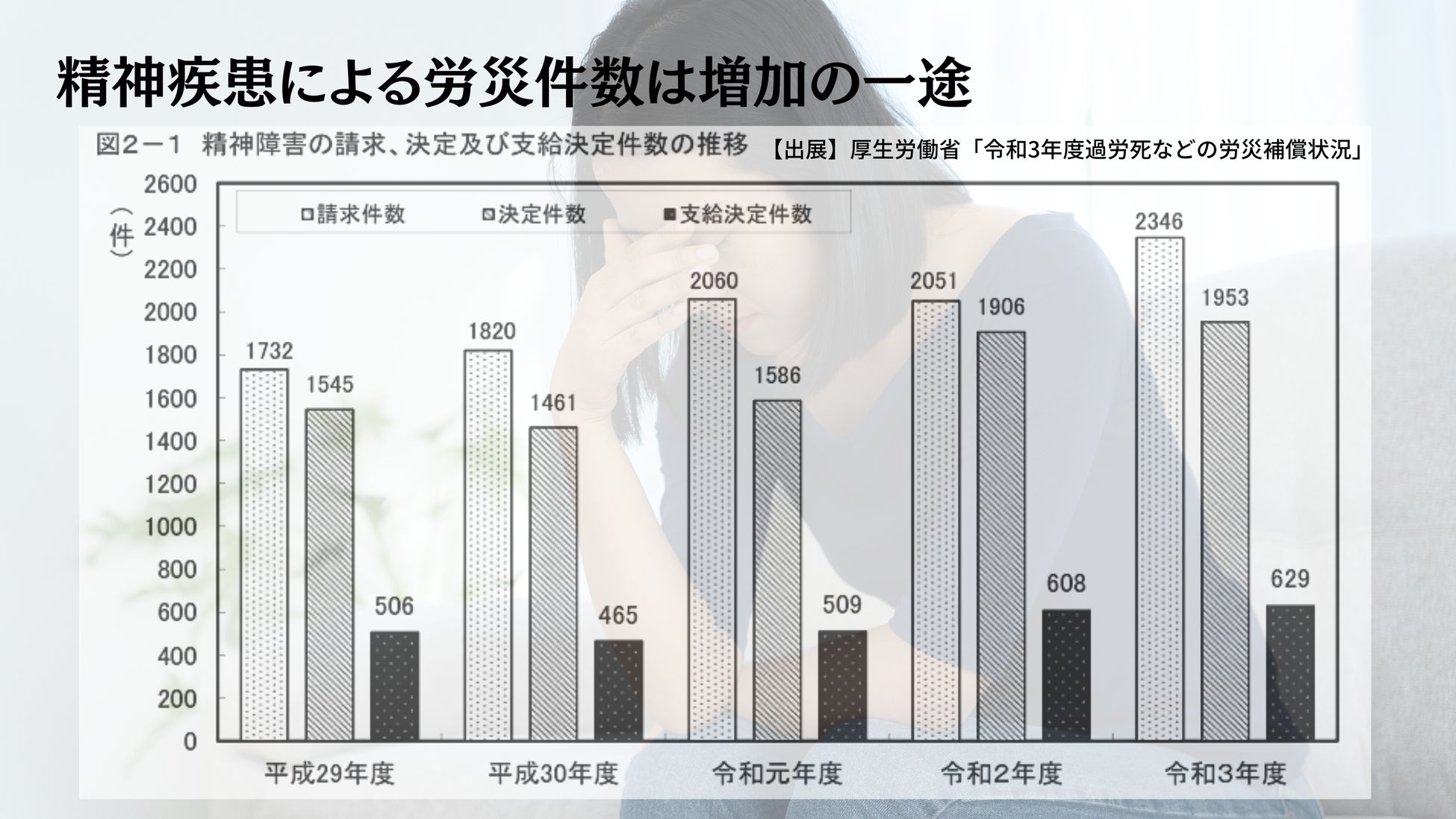 しかし、ウェルビーイング(*2)の内、「精神的な健康」を害して、精神疾患になるビジネスパーソンの増加は食い止められていません。(*2:ウェルビーイング:健康とは、病気ではないとか、弱っていないということではなく、「肉体的」にも、「精神的」にも、そして「社会的」にもすべてが満たされた状態であることをいう。「WHO憲章」より)