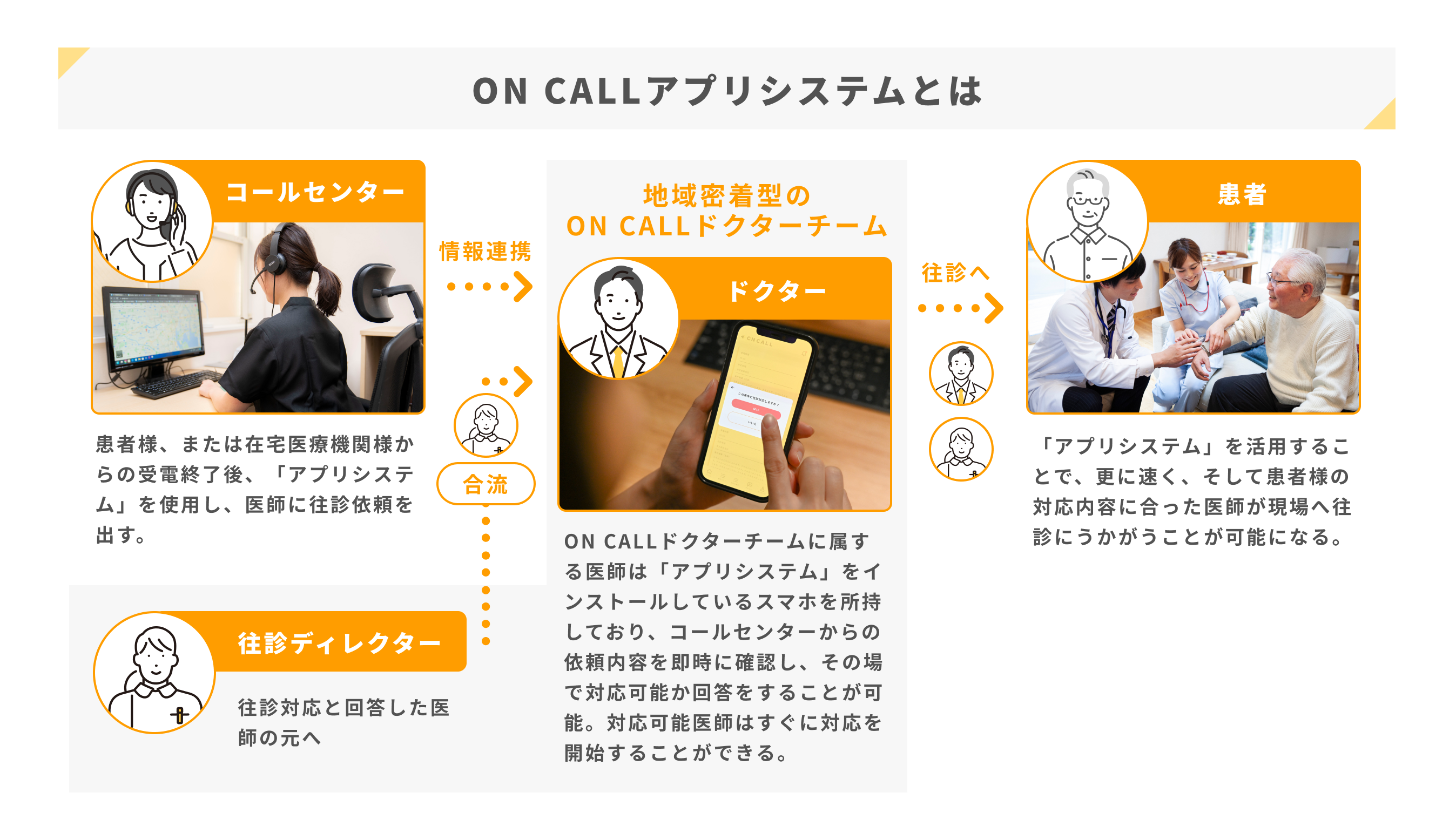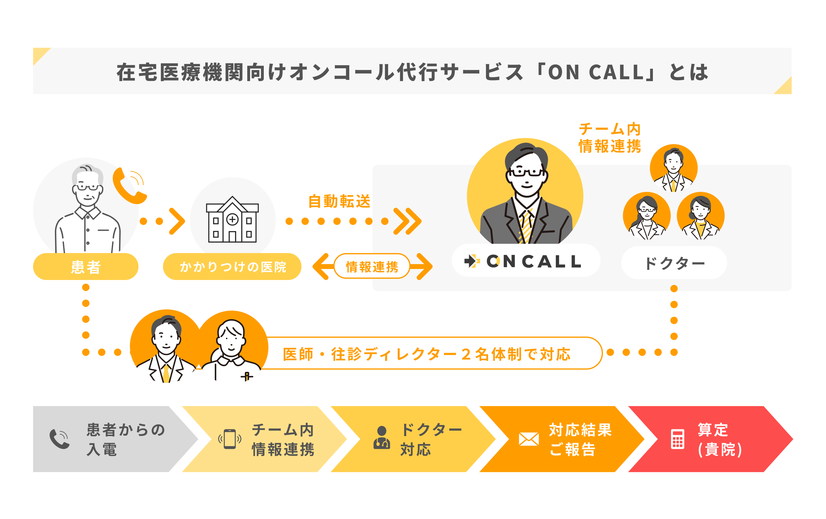 私たちは、在宅医療機関向けのオンコール代行サービスを提供している企業です。大きな病院に所属する若手医師を中心に往診対応毎にチームを組成し、医師とディレクター(看護師・救急救命士)の2名体制で往診を行っております。