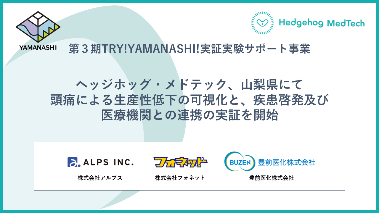 頭痛治療用アプリ開発と企業向け健康管理サービスの提供を行う株式会社ヘッジホッグ・メドテック(本社:東京都中央区、代表取締役 CEO:川田裕美、以下ヘッジホッグ・メドテック)は、山梨県が実施する「第3期TRY!YAMANASHI!実証実験サポート事業」を通じて株式会社アルプス(山梨県中巨摩郡昭和町、代表取締役社長 金丸滋)、株式会社フォネット(山梨県甲府市、代表取締役 清水栄一)及び豊前医化株式会社(山梨県中央市、代表取締役 豊前貴子)とともに、頭痛による生産性低下の可視化と、疾患啓発及び医療機関との連携の実証を開始いたしました。