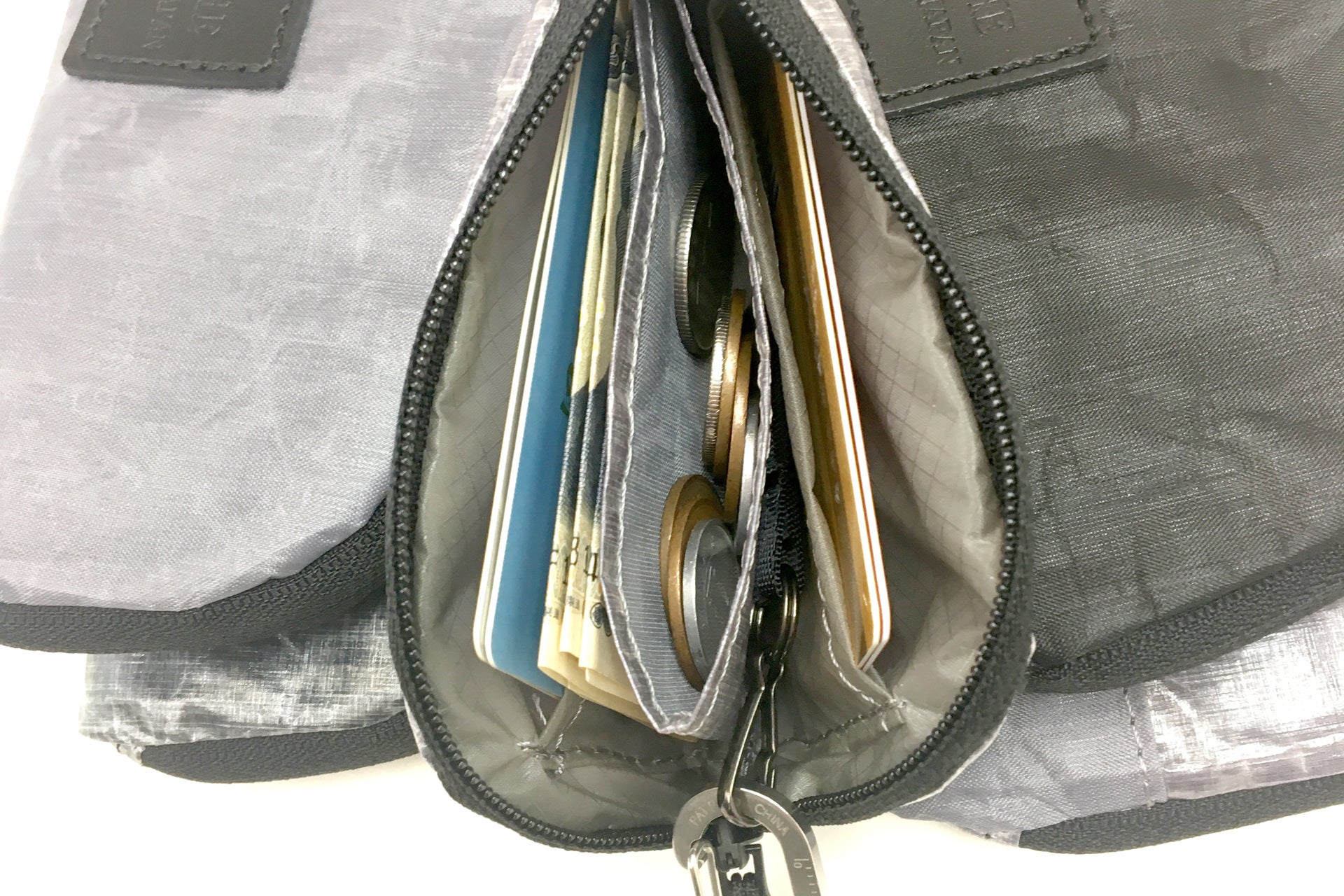 DCF Hybrid の表と裏をバリエーションにすることにより、DCF独特なツヤ感やシワ感、耐久性など機能面だけでなく、ミニマルなデザイン性にも優れ、三つ折り紙幣が入ります。