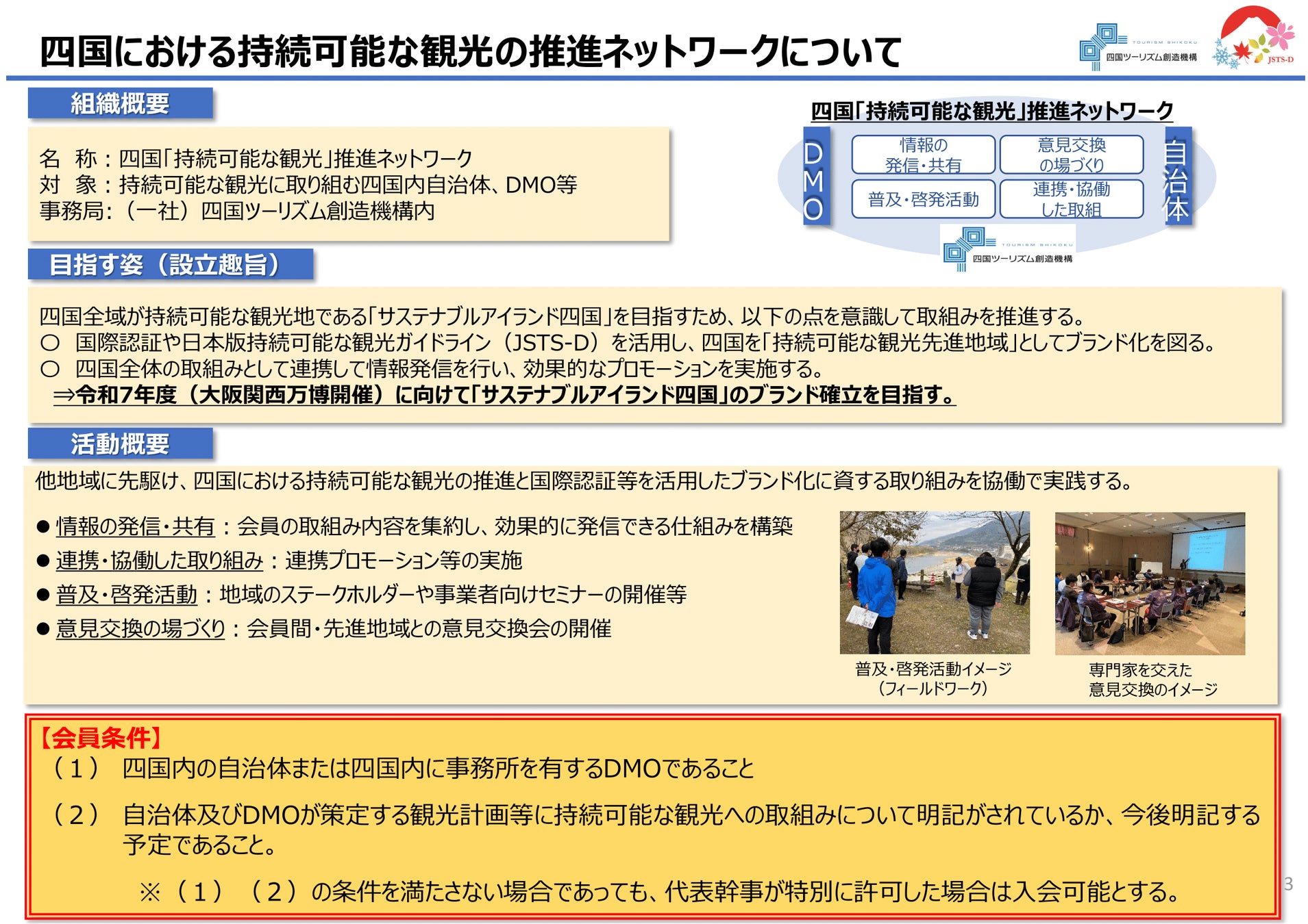 当機構では、「四国ブランドの確立」というビジョン実現に向け、国際認証や日本版持続可能な観光ガイドライン(JSTS-D)を活用した取組みに関する情報連携や協働したプロモーション等を実施するため、この度、市町村やDMOを中心とした四国における持続可能な観光の推進組織「四国「持続可能な観光」推進ネットワーク」を立ち上げ、次のとおり設立会議を開催いたしました。