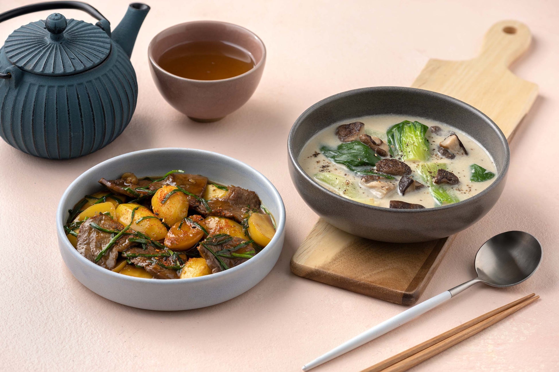 - オイスターソースでアレンジした中華風肉じゃがとチンゲンサイのパイタンスープ