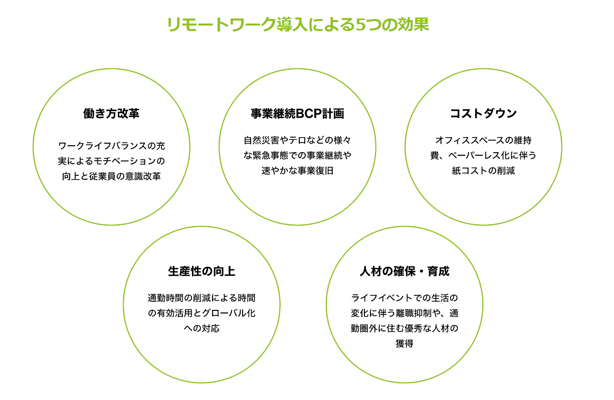 ライフワークバランスの充実によるモチベーション向上、人材の確保・育成の効率化、通勤時間やオフィス維持費などのコスト削減、災害やパンデミックなどが発生した場合の事業継続など、リモートワーク導入には人的資本の向上につながる効果があります。