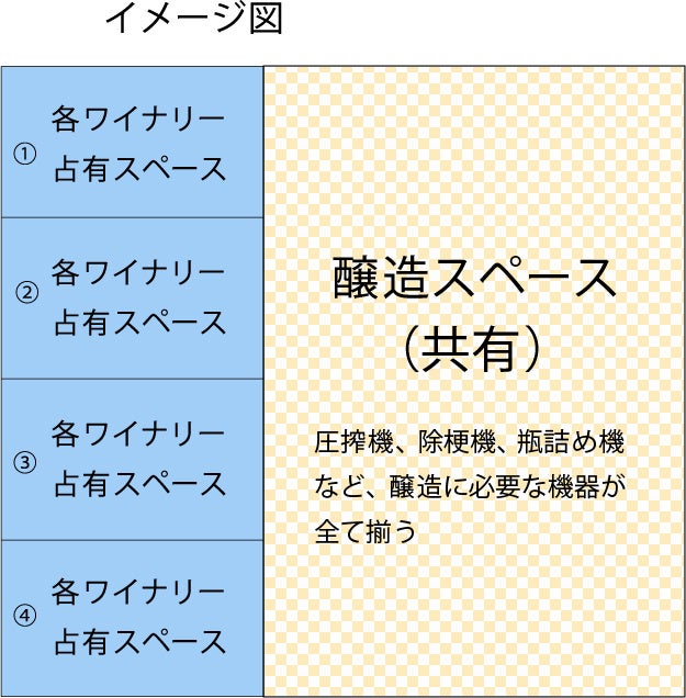 契約した人は醸造設備を共有し、かつそれぞれがオーナーとして各個人の占有部屋が割り当てられます。必要であれば従来よりワイナリーのサポート事業を行ってきた(株)JAPAN WineGrowersのサポートを受けることができます。また、占有スペースを持つことにより委託醸造では叶わなかった、「自分たちのワイナリー」として関係者を案内するということが可能になります。