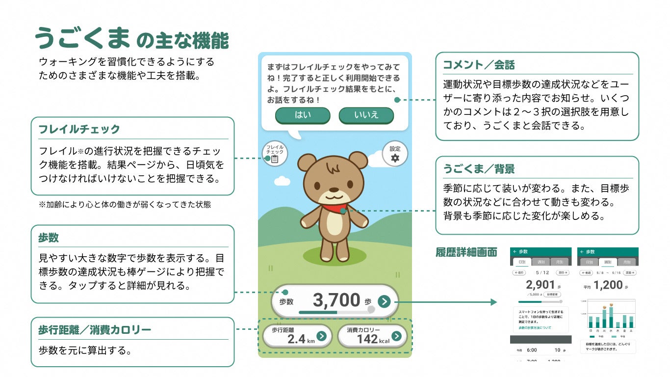 ウォーキングアプリ「うごくま」は歩数計アプリで、かわいいキャラクターの「うごくま」がウォーキングの継続をスマホから応援してくれます。実証実験では、シニアウォーキングの習慣化に繋がるアプリ「うごくま」の有効性を確認します。この取組を通じて、本市のDXと高齢者の介護予防を推し進めてまいります。