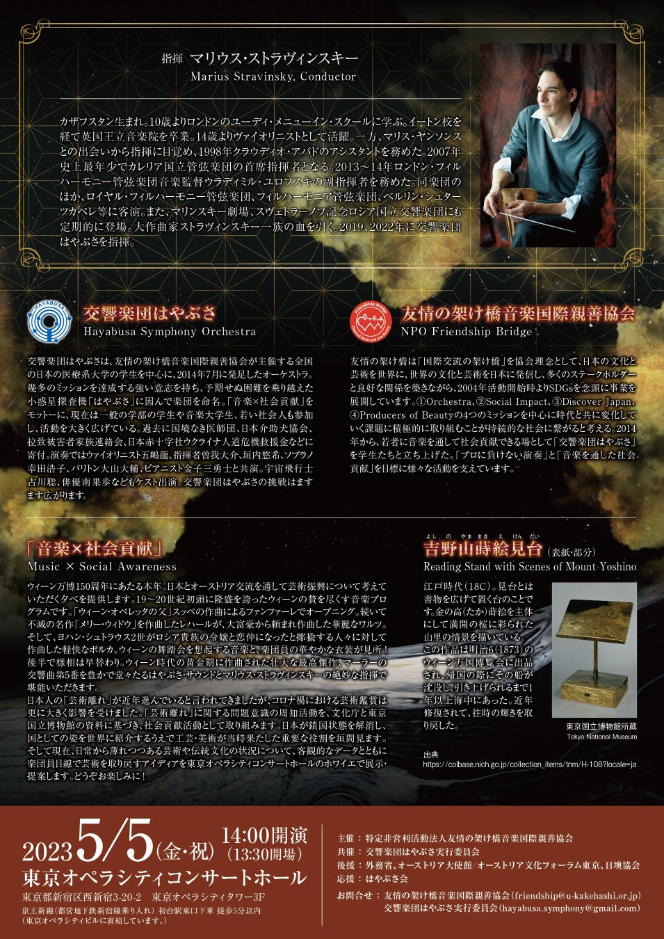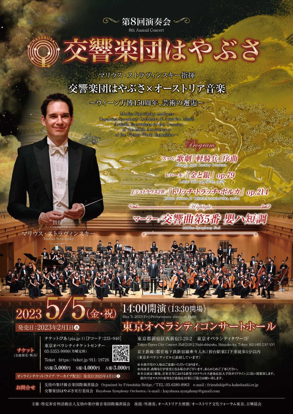 特定非営利活動法人友情の架け橋音楽国際親善協会(所在地:千代田区麹町、以下当協会)は、第8回演奏会「交響楽団はやぶさ×オーストリア音楽~ウイーン万博150周年、芸術の邂逅~」を東京オペラシティコンサートホールにて、2023年5月5日(金・祝)に開催いたします。