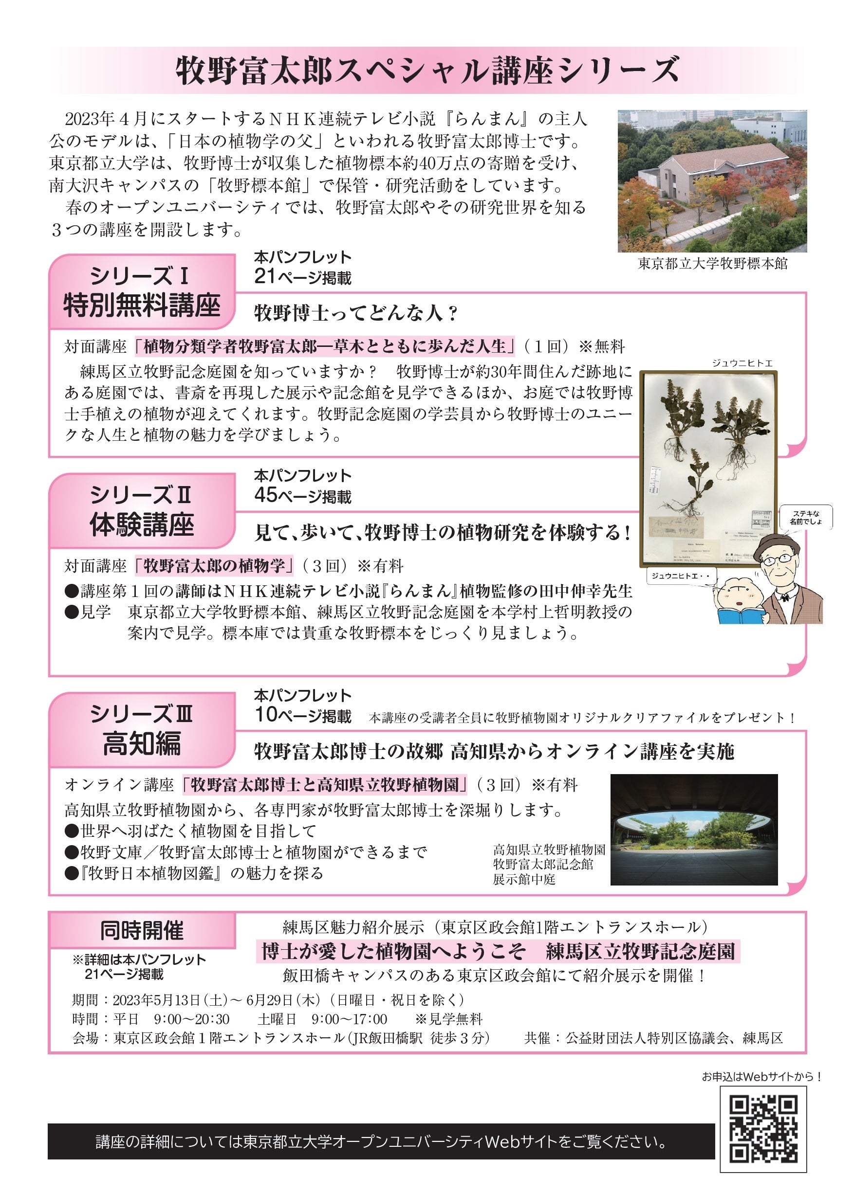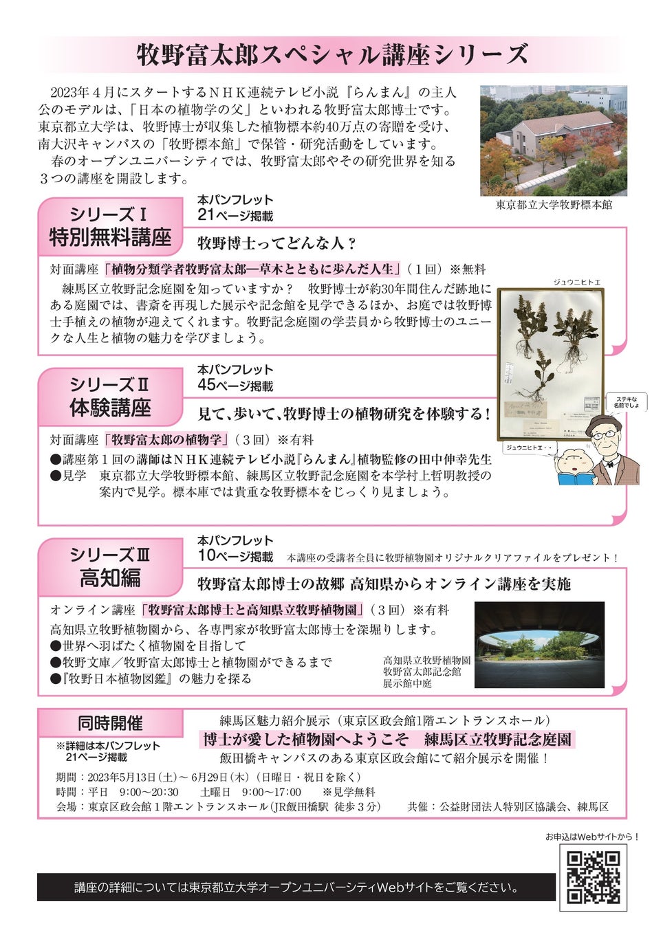 さらに、春期講座では「牧野富太郎スペシャル講座シリーズ」と題して、上記のオンラインスペシャル講座「牧野富太郎博士と高知県立牧野植物園」を含め、牧野富太郎やその研究世界を知る講座を全部で3つ開講します。