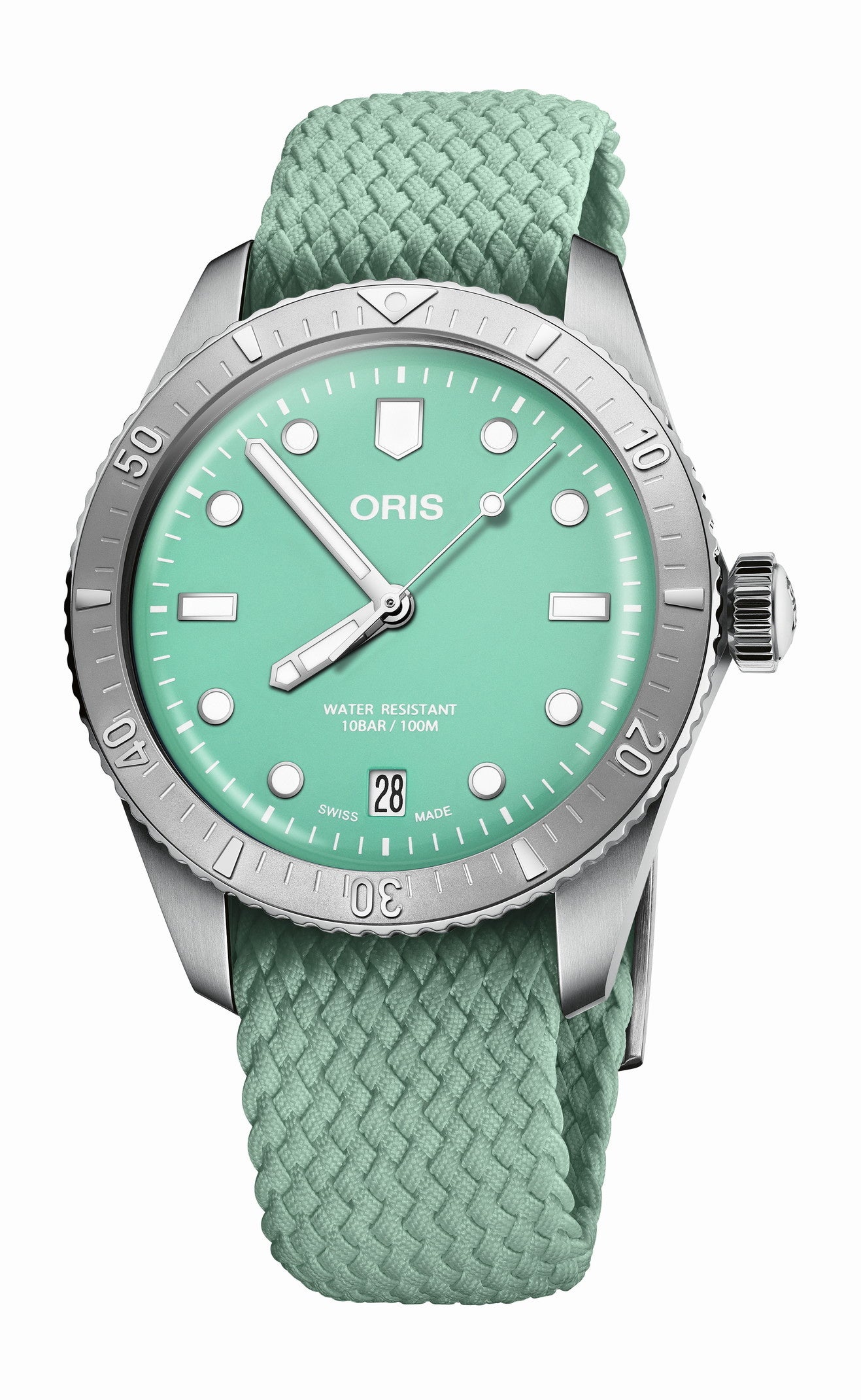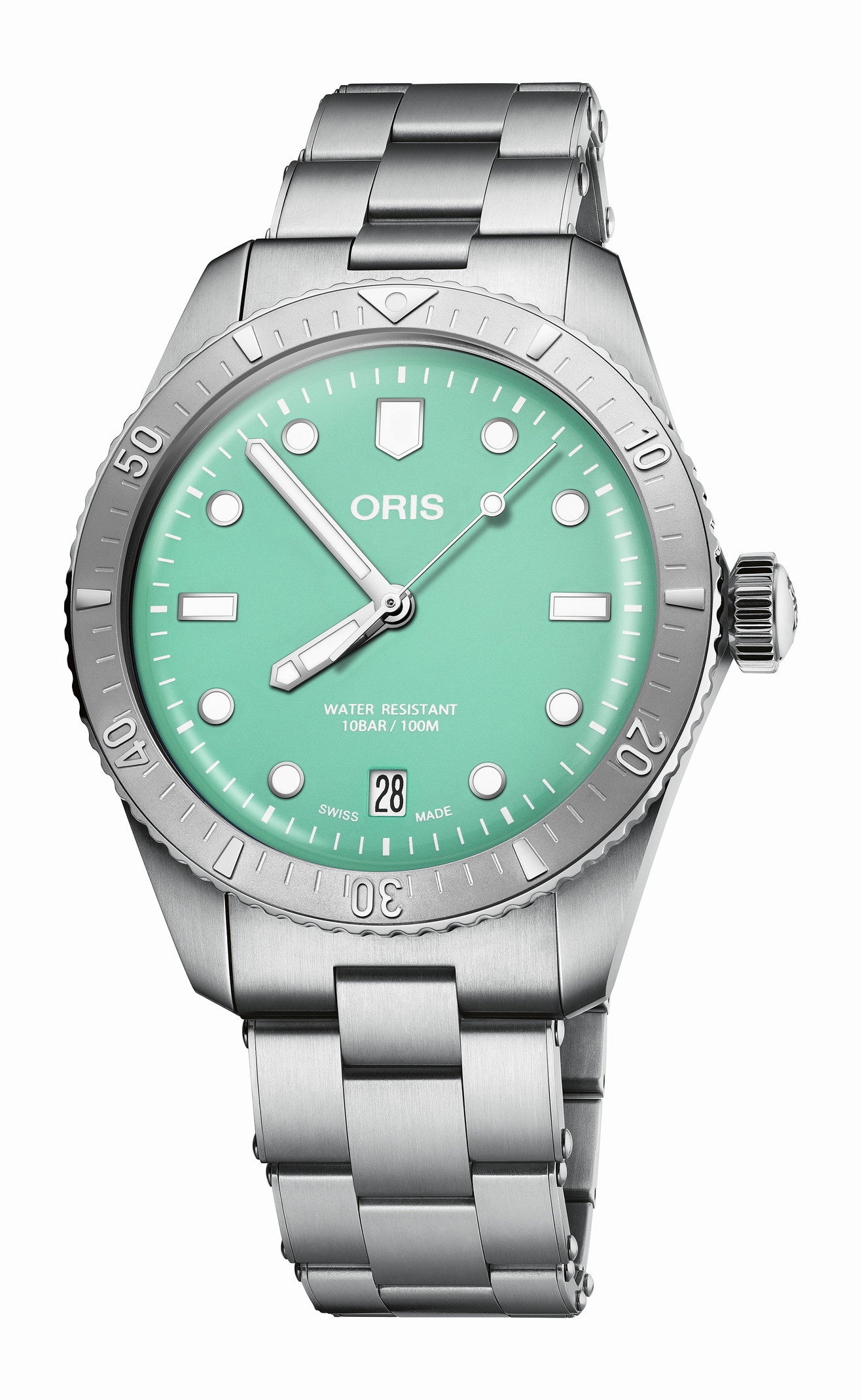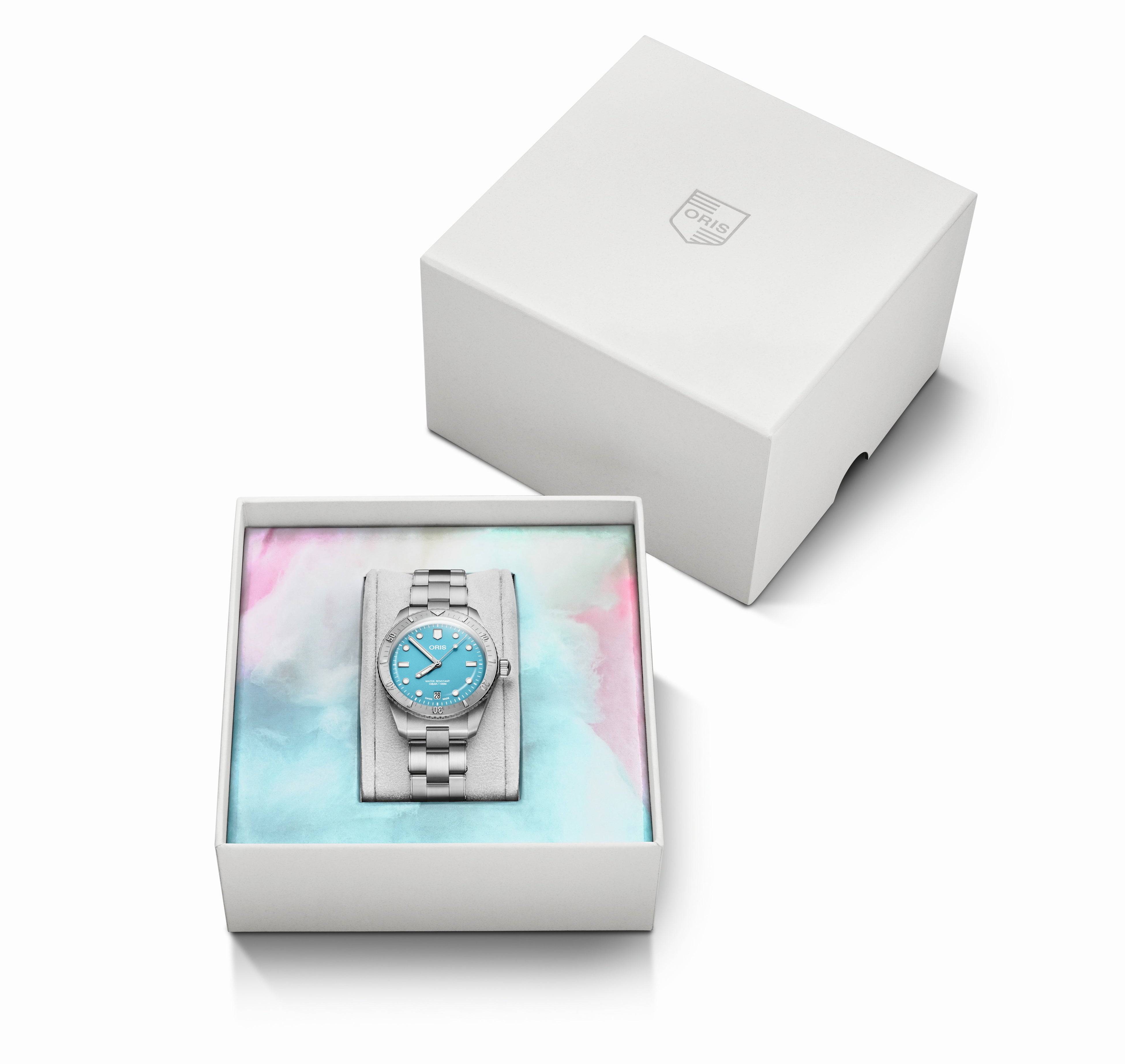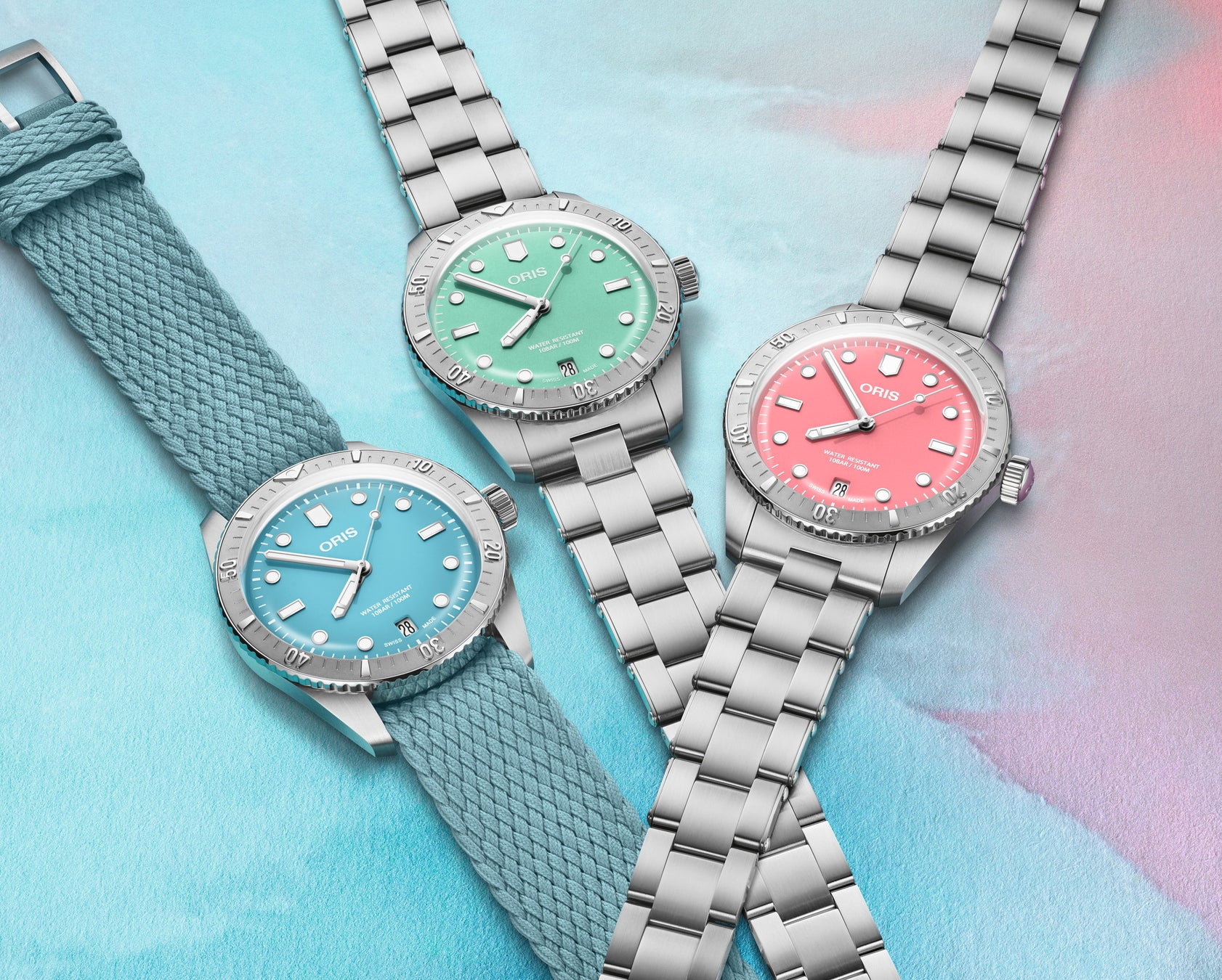 発売同時に初回入荷分を完売した、大人気のダイバーズ65コットンキャンディのブロンズバージョンに続いて、ステンレススチールのモデルが登場します。先発のブロンズバージョン同様、ブルー、グリーン、ピンクのカラフルなダイアルパレットで、1965年に発表したオリス初のダイバーズウオッチのデザインを踏襲したレトロなデザインのシリーズに、ポップなダイナミズムを加えます。