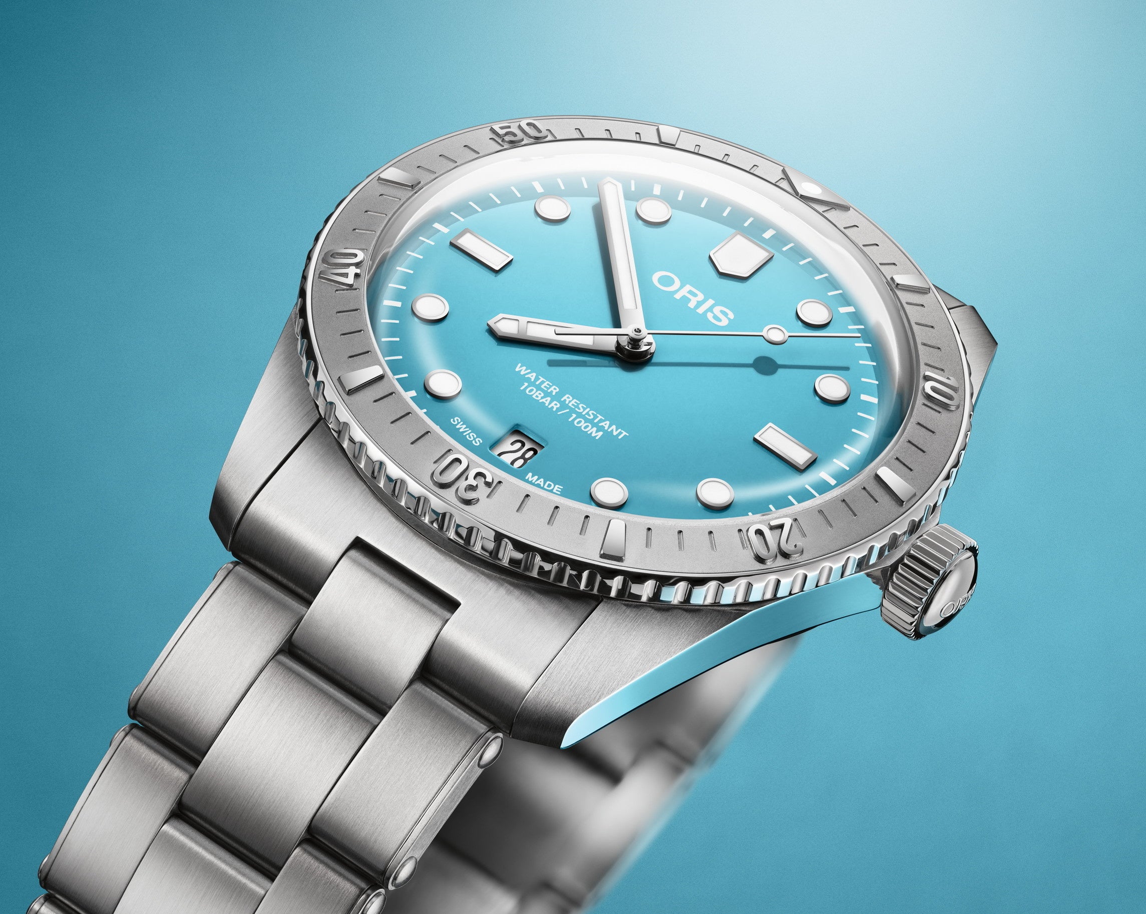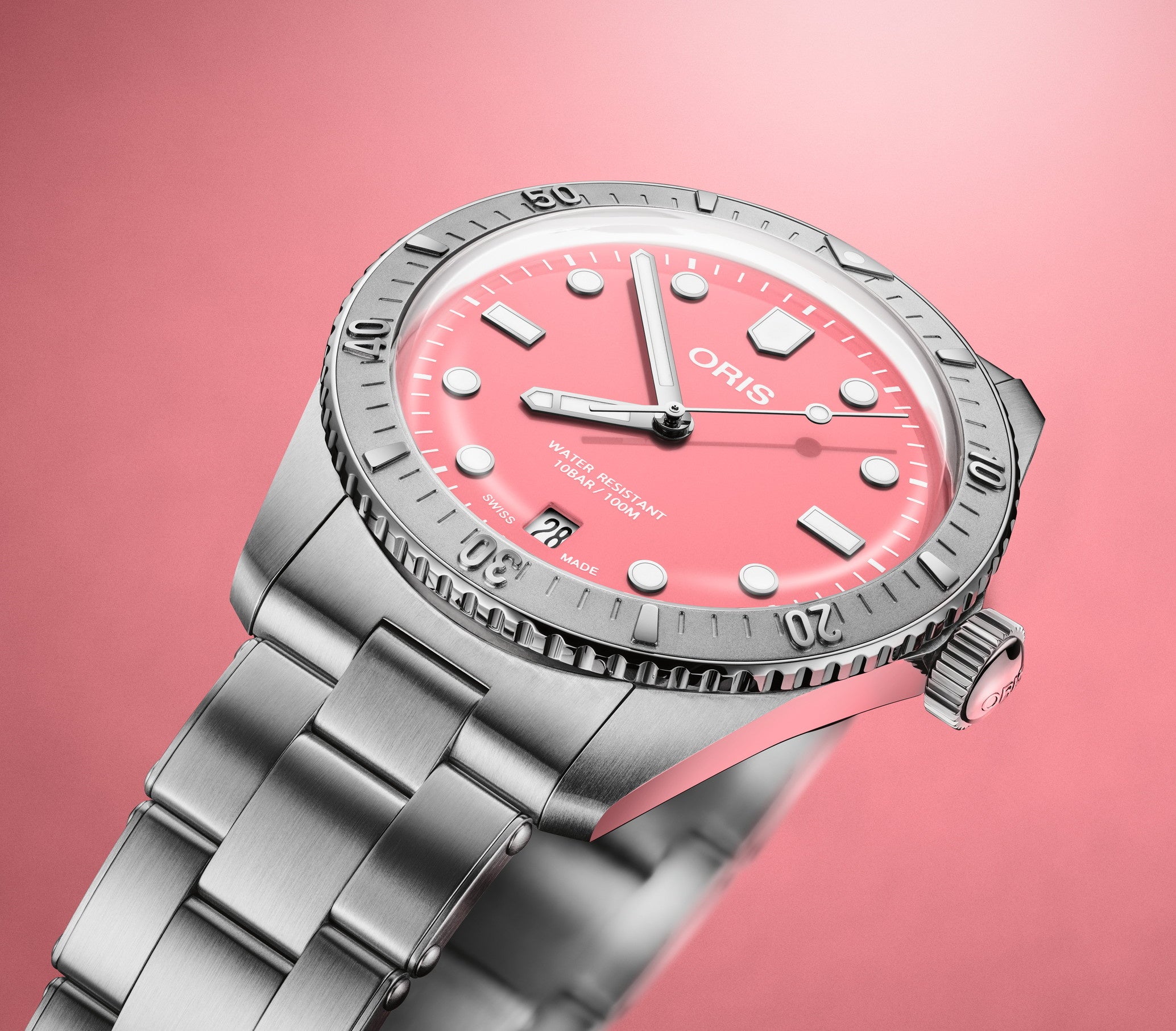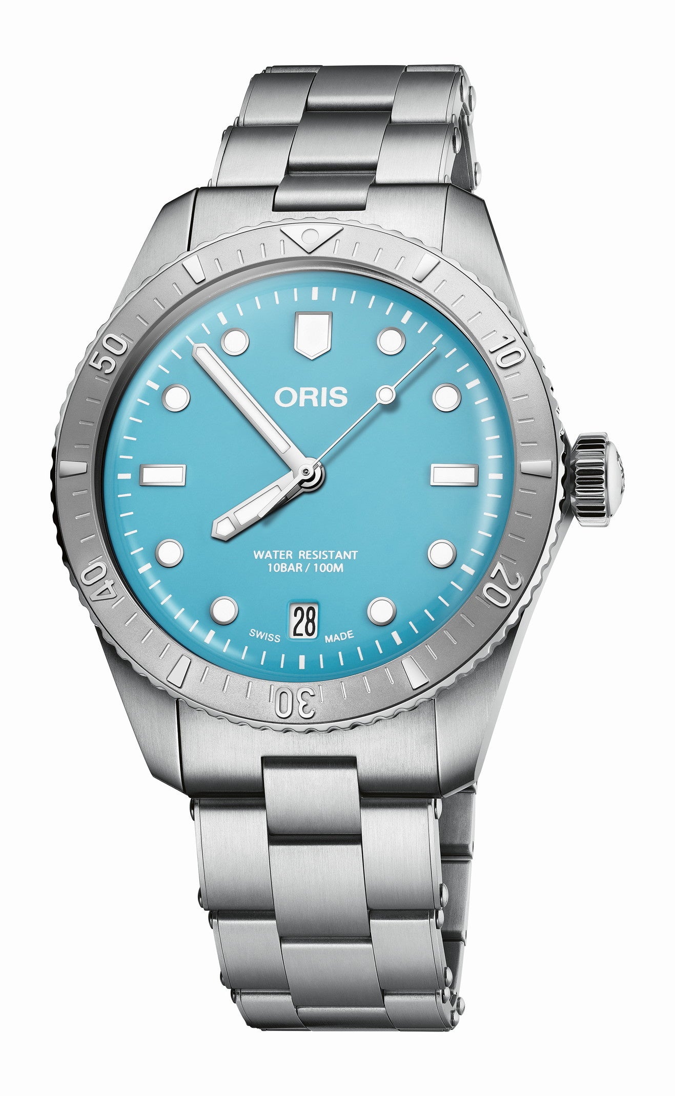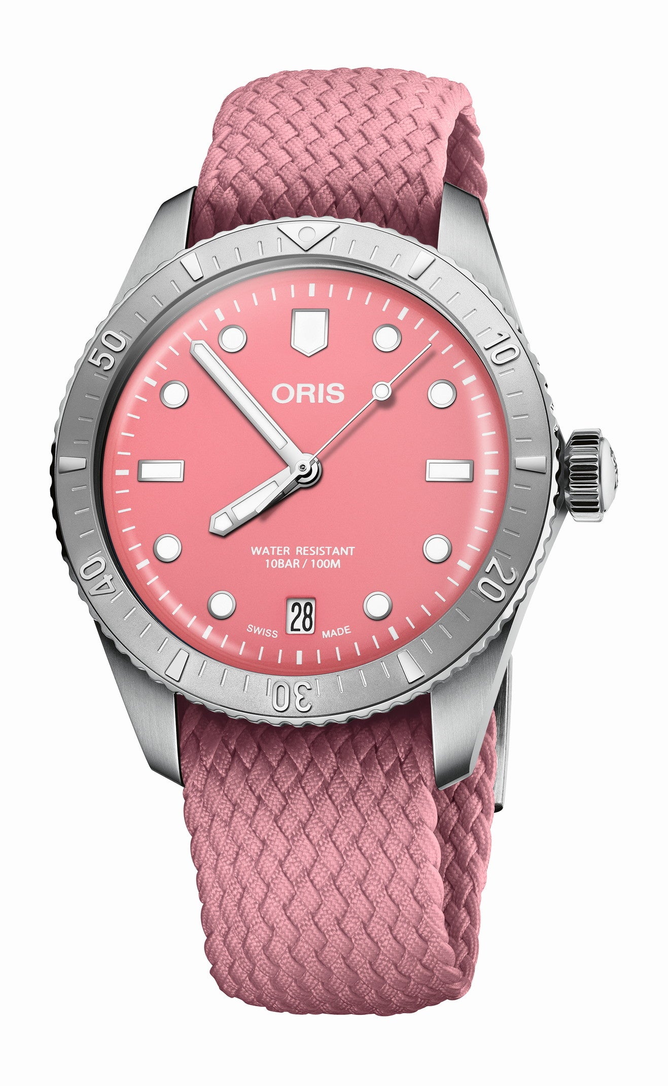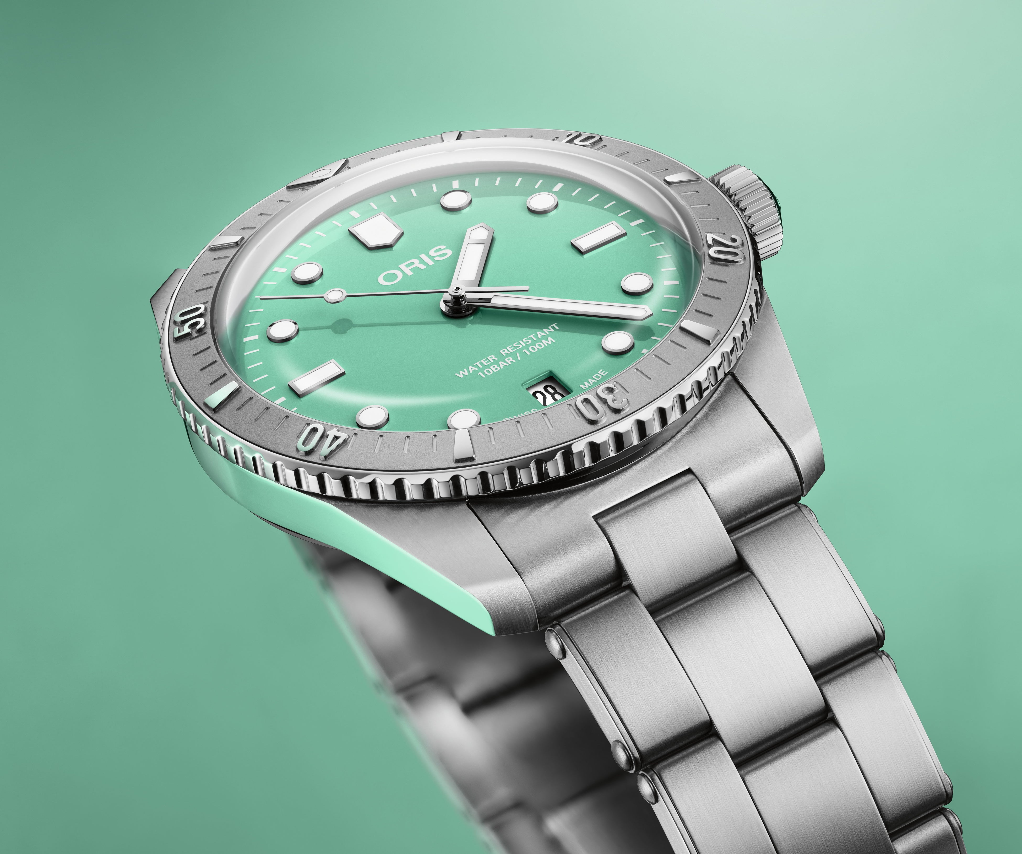 発売同時に初回入荷分を完売した、大人気のダイバーズ65コットンキャンディのブロンズバージョンに続いて、ステンレススチールのモデルが登場します。先発のブロンズバージョン同様、ブルー、グリーン、ピンクのカラフルなダイアルパレットで、1965年に発表したオリス初のダイバーズウオッチのデザインを踏襲したレトロなデザインのシリーズに、ポップなダイナミズムを加えます。