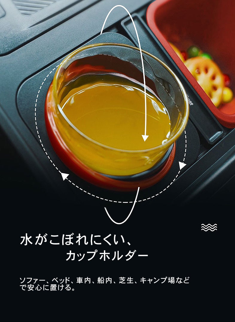 水やドリンクなどの飲み物を入れている時、30度以上傾けてもこぼれにくい設計となっています。また、カップホルダーの底の直径は65.16mmで市場の飲み物のカップやボトルのサイズにはほぼ対応可能です。ソファーやベッド、車内などでうっかり飲み物をこぼしがちな悩みをしっかり解決してくれます。