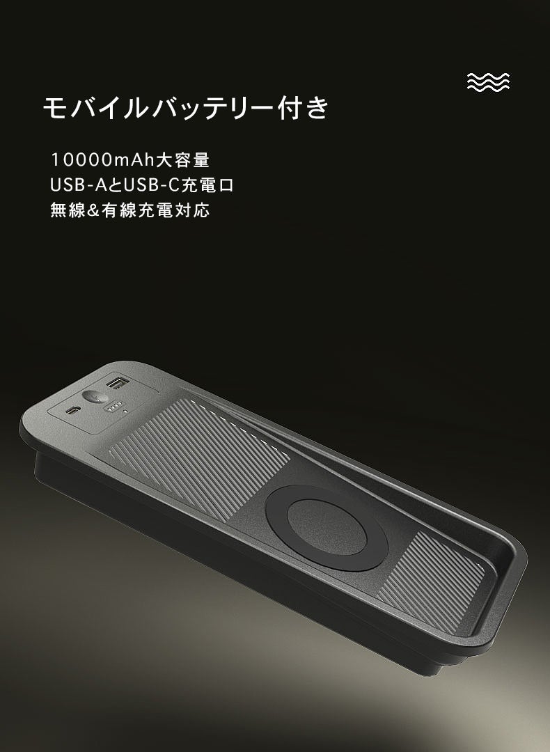 USB-AとUSB-C充電口が付いているので、いつでもどこでも「スマートフォン、スマートウォッチ、イヤホン、ゲームパッド、マウスなど」の電子機器の充電が可能です(無線&有線充電対応)。特にキャンプ先などでのスマホを充電することができるので、アウトドアでの使用としても最適です。