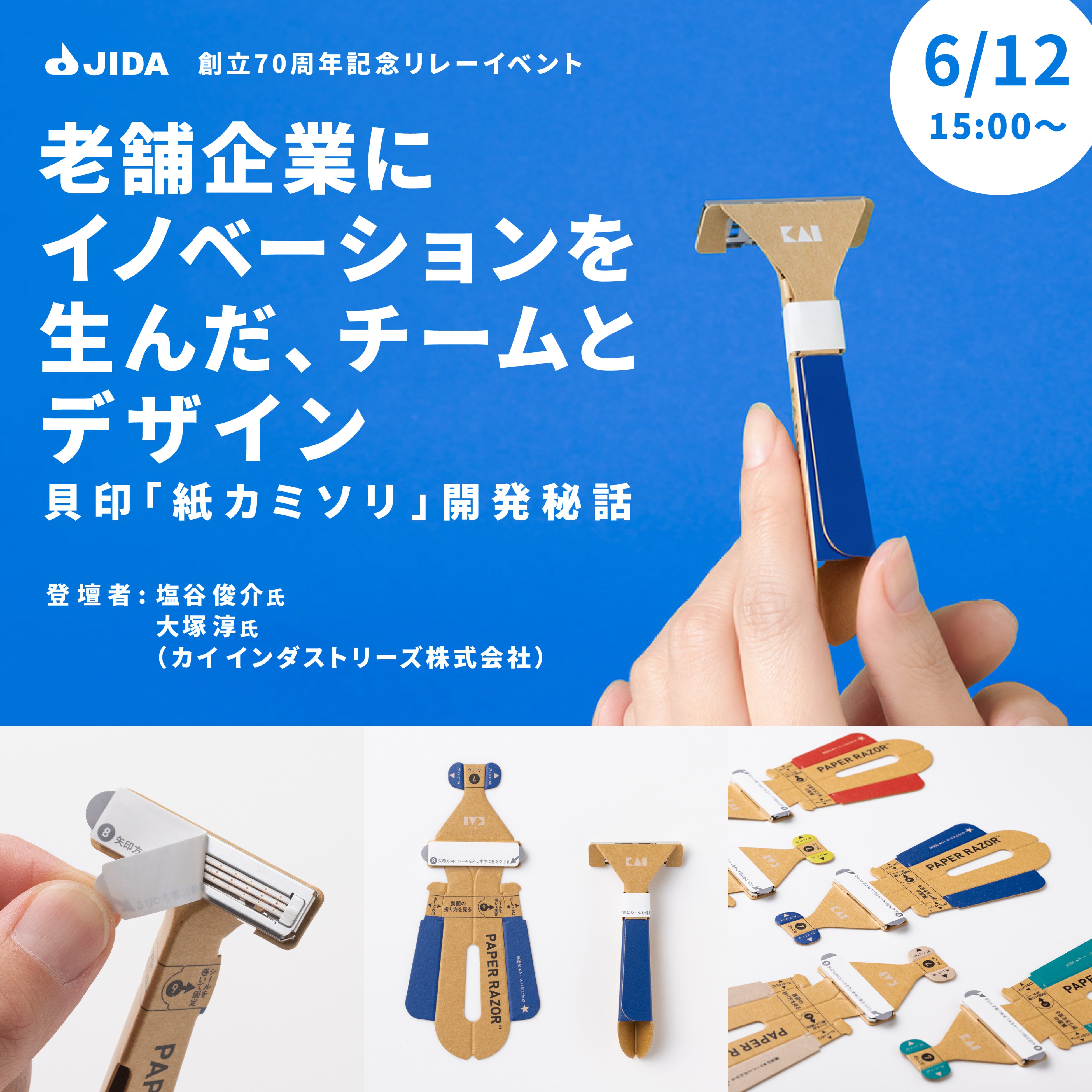 紙カミソリのプロジェクトマネージャー塩谷氏と、貝印のデザインの統括をする大塚氏をお招きし、チームビルディングから量産までの紆余曲折を、多角的に話していただきます。