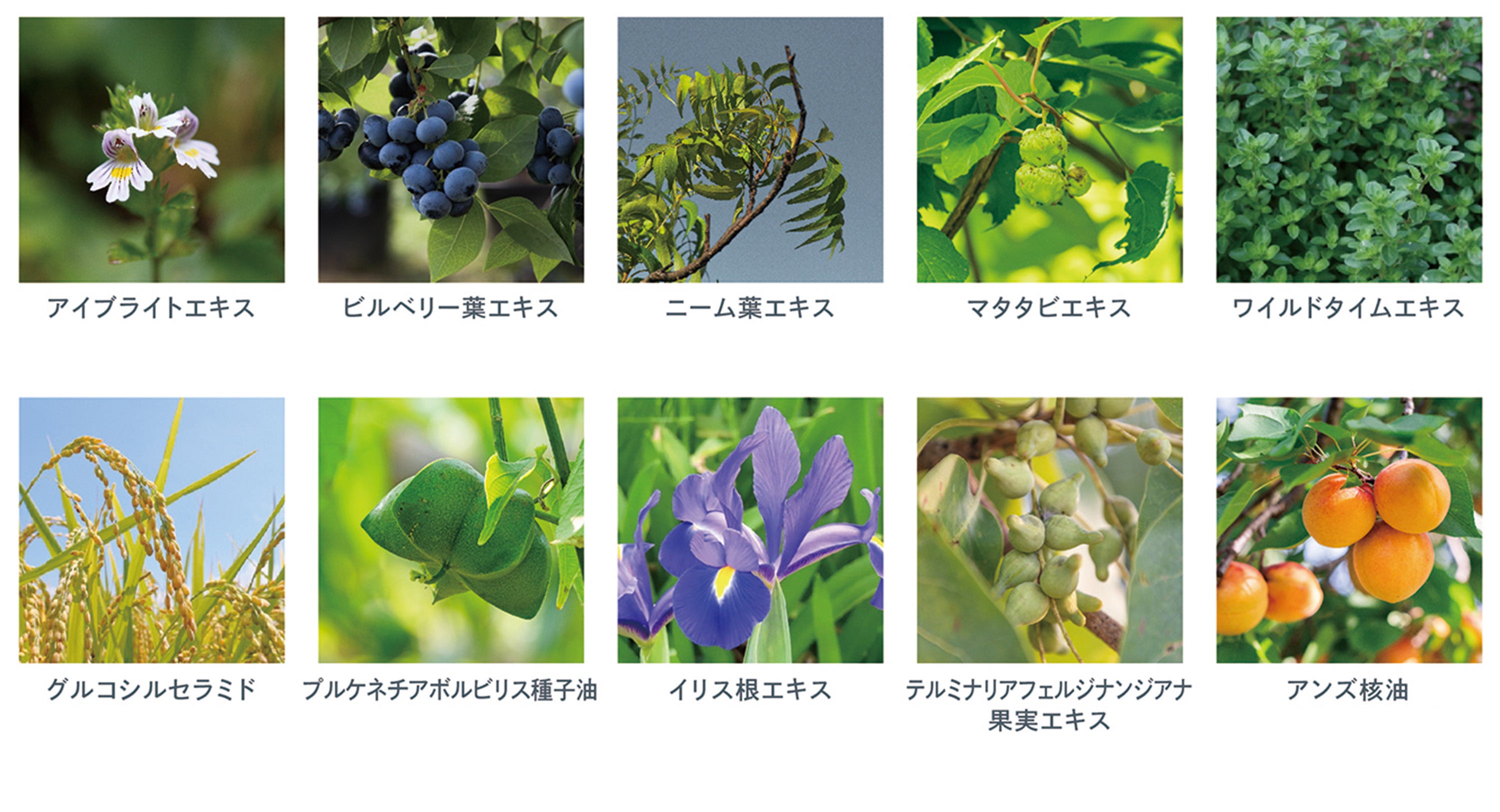 「AINOKI mebuki」の製品には、いきいきとした目元へと導くために厳しい自然環境の中で育まれた植物成分が欠かせません。アイブライトエキスをはじめ、ブルーライトから目元をケアするビルべリー葉エキス、高保湿でヒアルロン酸を含むシロキクラゲ多糖体やネムノキ樹皮エキスなどを配合。また、ツボクサ葉エキス、“奇跡の木”と呼ばれるニーム葉エキスなども共通成分として配合されています。