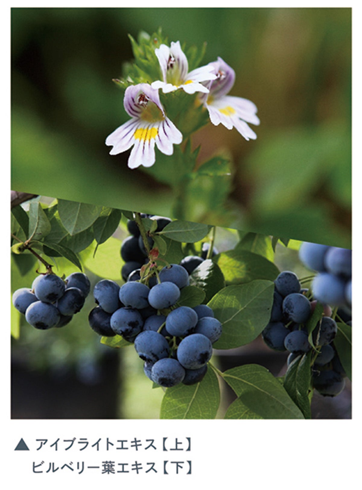 オーガニックのアイブライトエキスやセイヨウサンザシ果実エキス、ラベンダー花エキスを配合。ブルーライトから目元を守ってくれるビルベリー葉エキス配合。