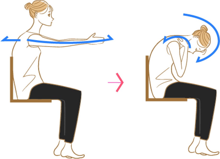 椅子に座り、優しく前へならえをしてそっと両手を合わせます。指先で前にあるものを突くように、肩甲骨から腕を前に移動させます。このとき、自然に背中は丸くなります。