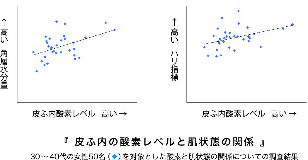 様々な肌について長年研究し続けたところ、皮ふ内の酸素レベルには個人差があり、酸素レベルが高いほど角層の水分量や、ハリ指標も高いことが判明しました。