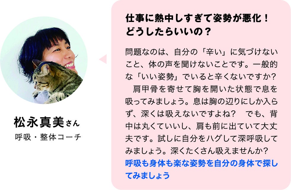 - デジタルコンテンツ監修の松永先生から。凝り固まった姿勢や止まりがちな呼吸に意識を向けて!上手な“息抜き” で酸素不足を改善!