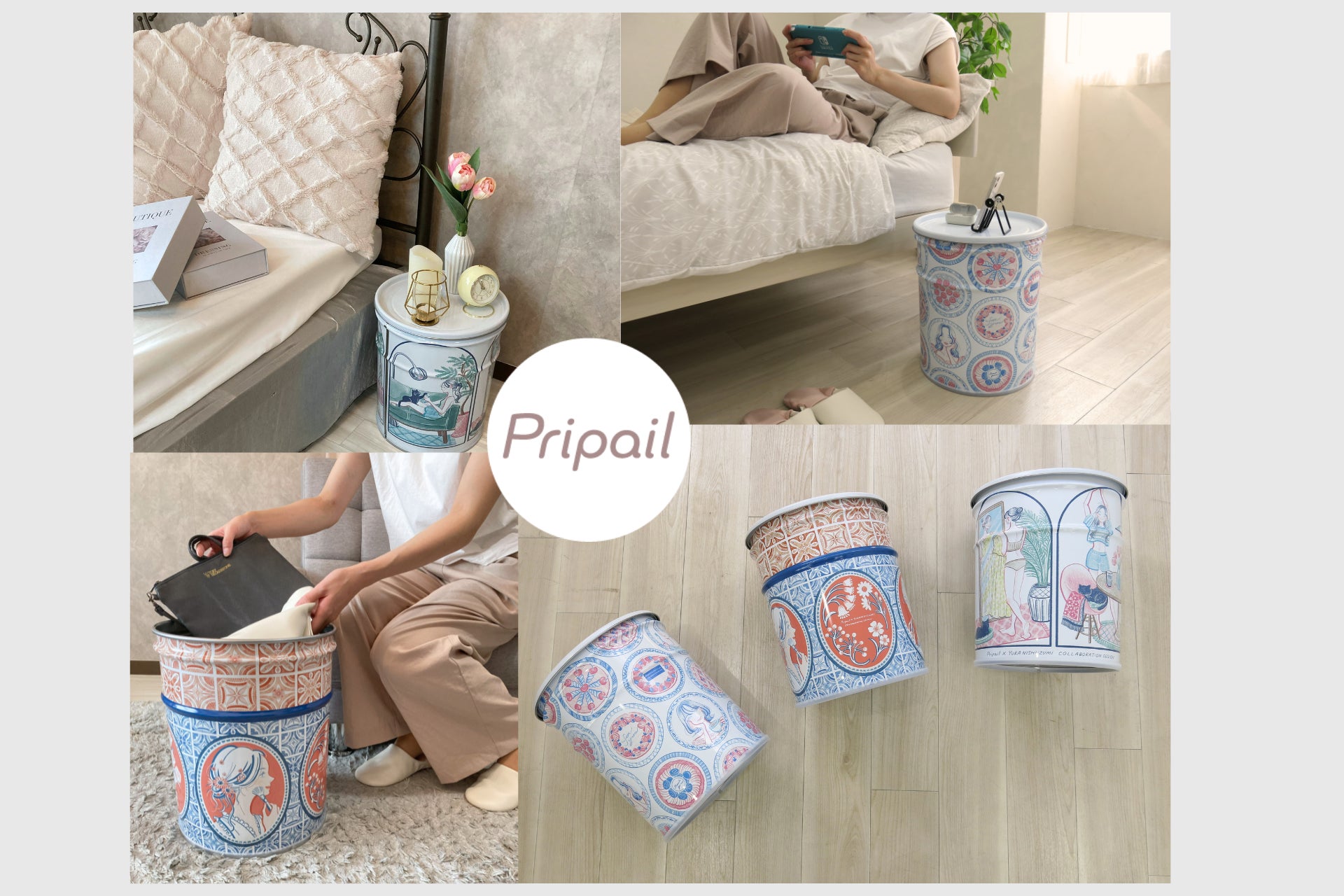 「ペール缶」はバケツ(pail)形のスチール製容器でドラム缶の一種。主に工業用で使われることが多い。ドラム缶と違い持ち運びやすいサイズで外面に多彩な印刷ができることから、スツールやインテリアとして一般家庭での利用も増えている。通常、ペール缶には持ち手の“つる”がついているが、Pripailは持ち手をなくすことでインテリアとしてのデザイン性を高めている。