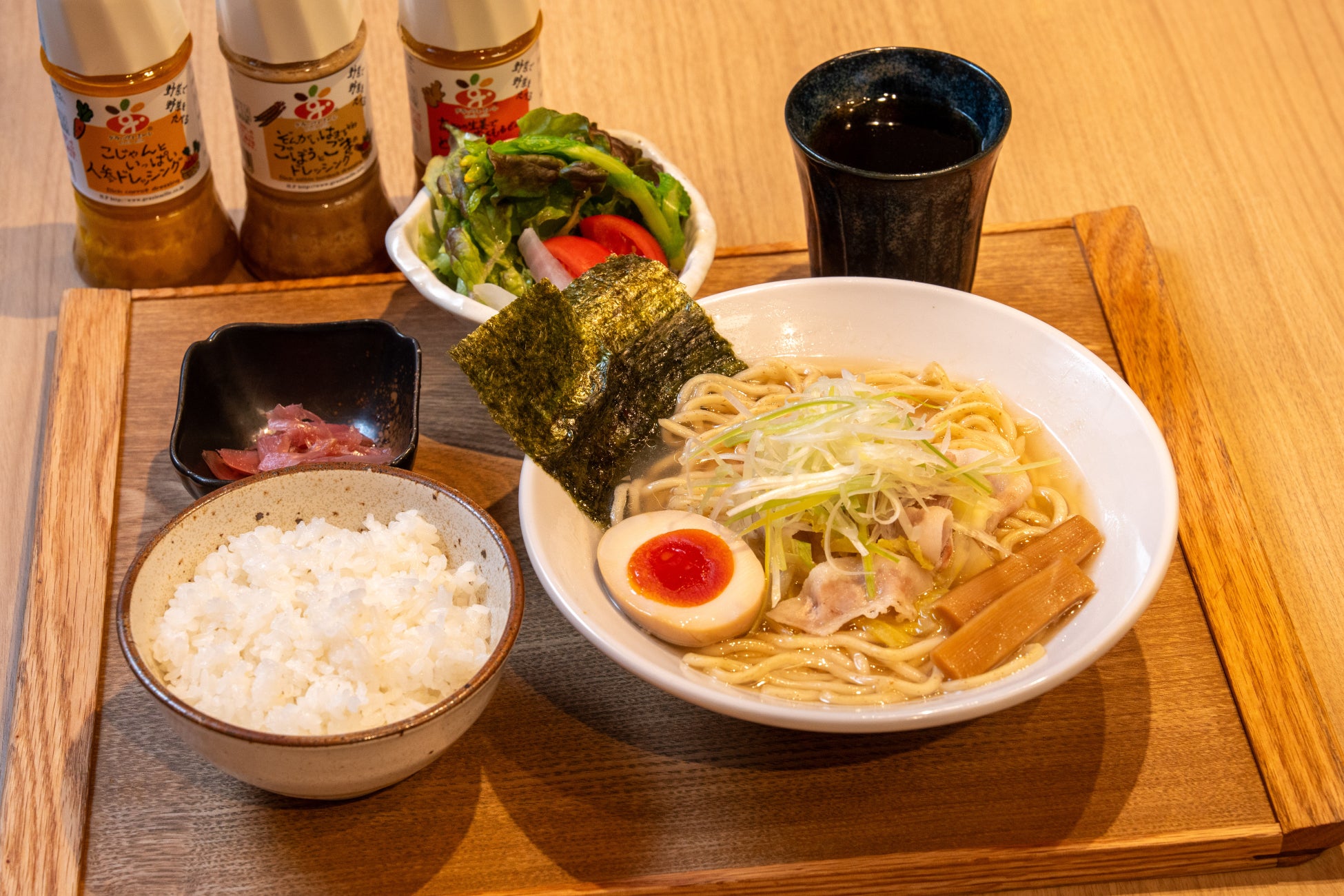 朝ラーメンに、ご飯・サラダ・小鉢がついたバランス抜群の定食。