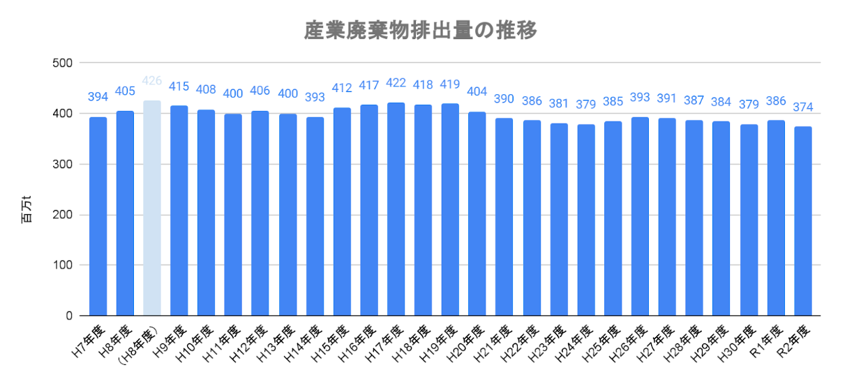 環境省の調査「産業廃棄物の排出及び処理状況等(令和2年度実績)」によると、令和2年度における全国の産業廃棄物の総排出量は約3億7,400万トンであり、前回の調査結果(令和元年度実績)から約1,200万トン減少(3.1%減)にとどまっています。