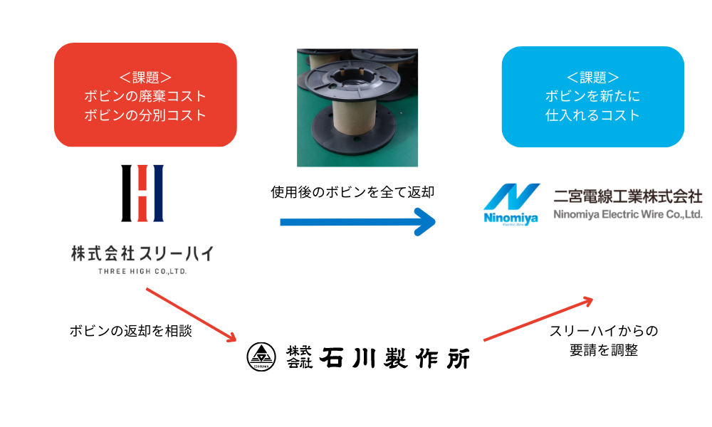 この雑談を受けたスリーハイの代表の男澤は「廃棄物削減のため、二宮電線工業に使用済みのボビンを戻したい」旨、両者間と取りまとめている商社である、石川製作所に相談をしました。
