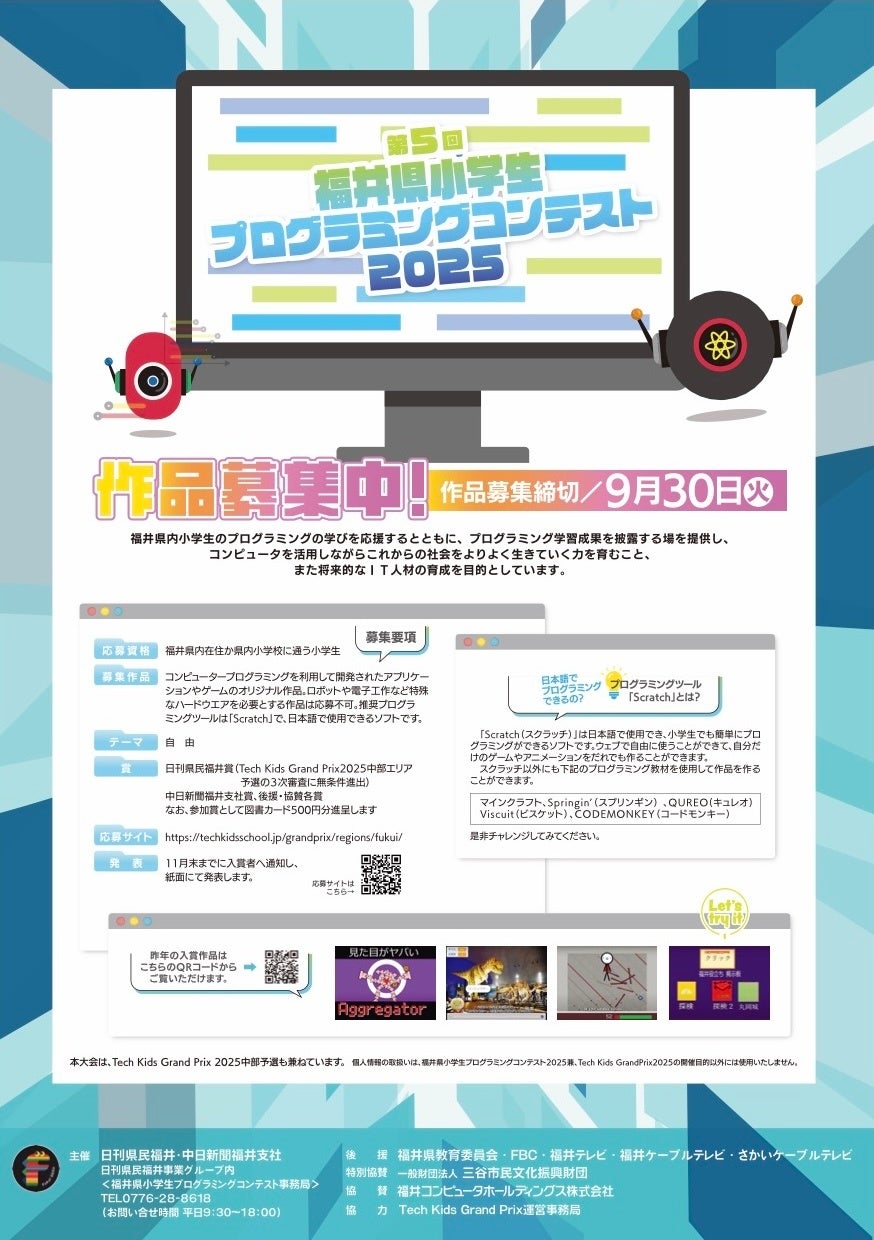 小学生にプログラミングへの関心や学習意欲を高めてもらい、さらなるスキルアップを目指してもらおうと日刊県民福井と中日新聞福井支社はコンテストを開催します。