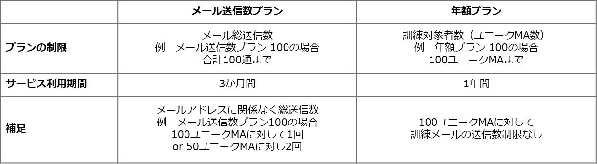 「メール送信数プラン」は、標的型攻撃メール対する現状把握や定期的に1回の訓練を実施する企業や組織のニーズに対応したコストを抑えたプランです。「年額プラン」は、通常のメールに紛れこませるなど不定期に複数回の訓練を実施し、標的型攻撃メールに対して耐性の強化を図る企業や組織のニーズに対応した最適なプランです。