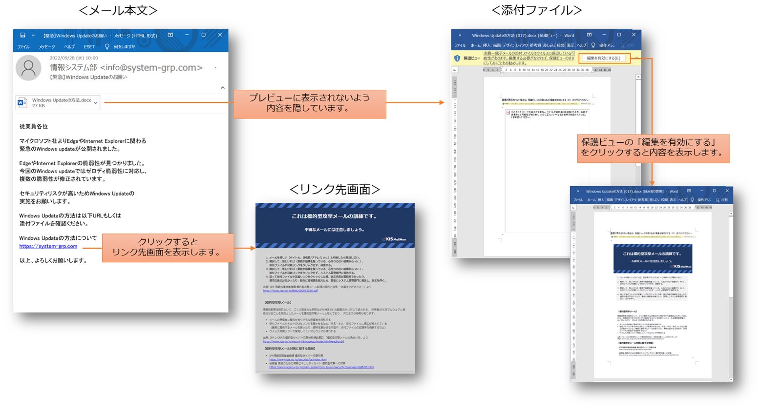 訓練シナリオギャラリーは、代表的なEmotetを模した添付ファイル型、URLリンク型(フィッシング型)、