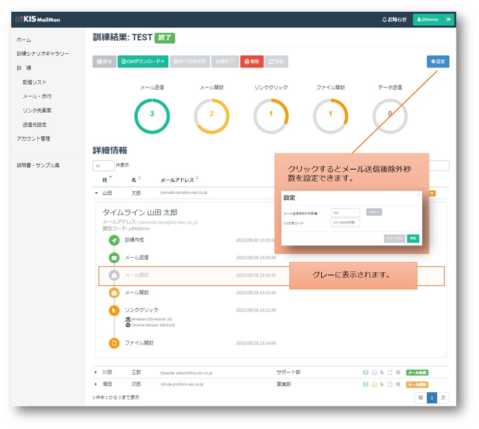 またsandboxによる開封など意図しないメール開封がある場合に、除外できるようステータスの記録開始時間を設定することができます。詳細情報ではグレー表示し、グラフからも削除されます。記録開始時間の設定により判別し易くなります。