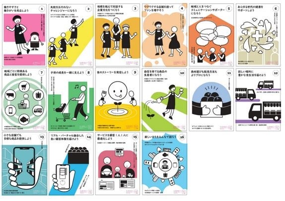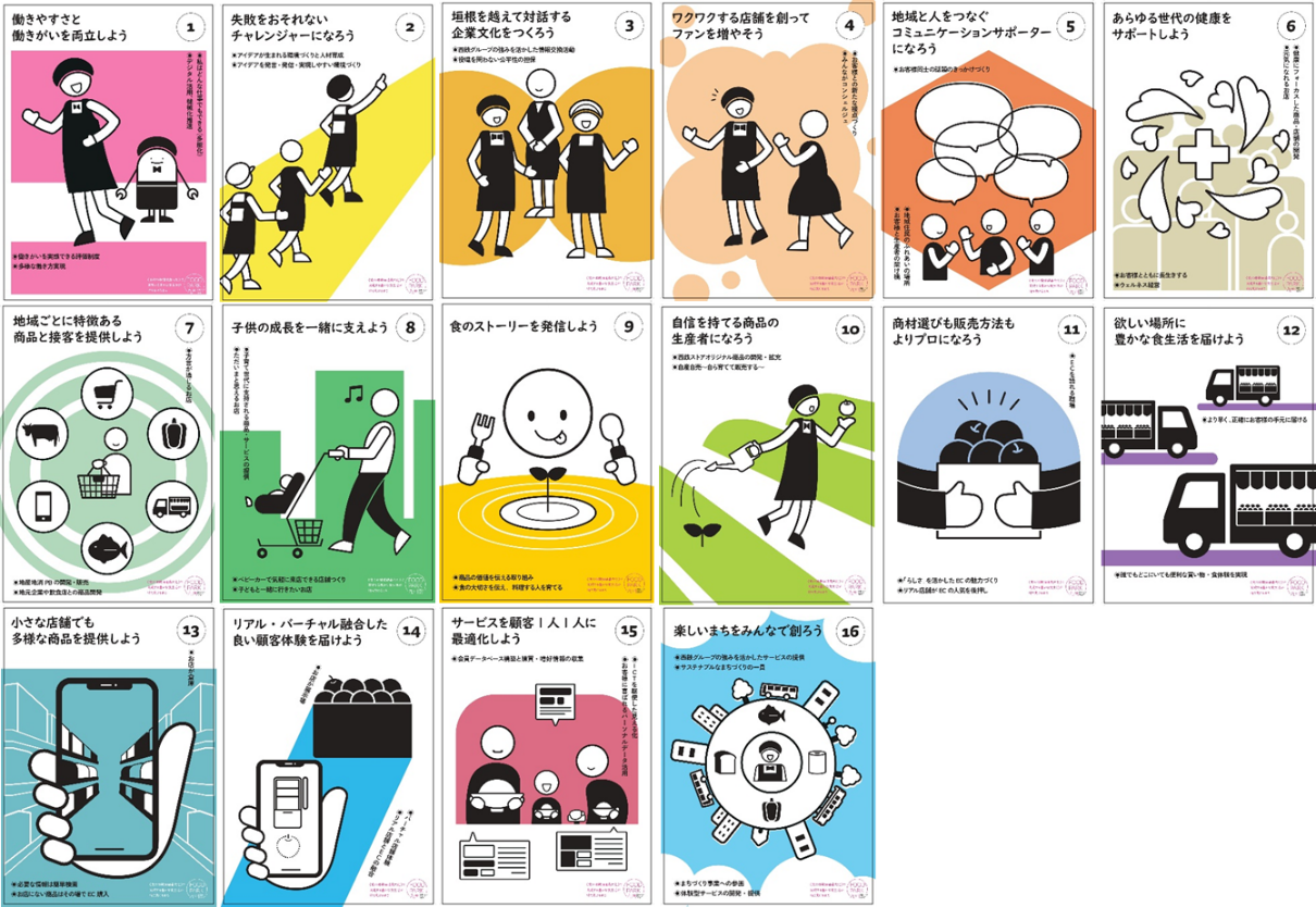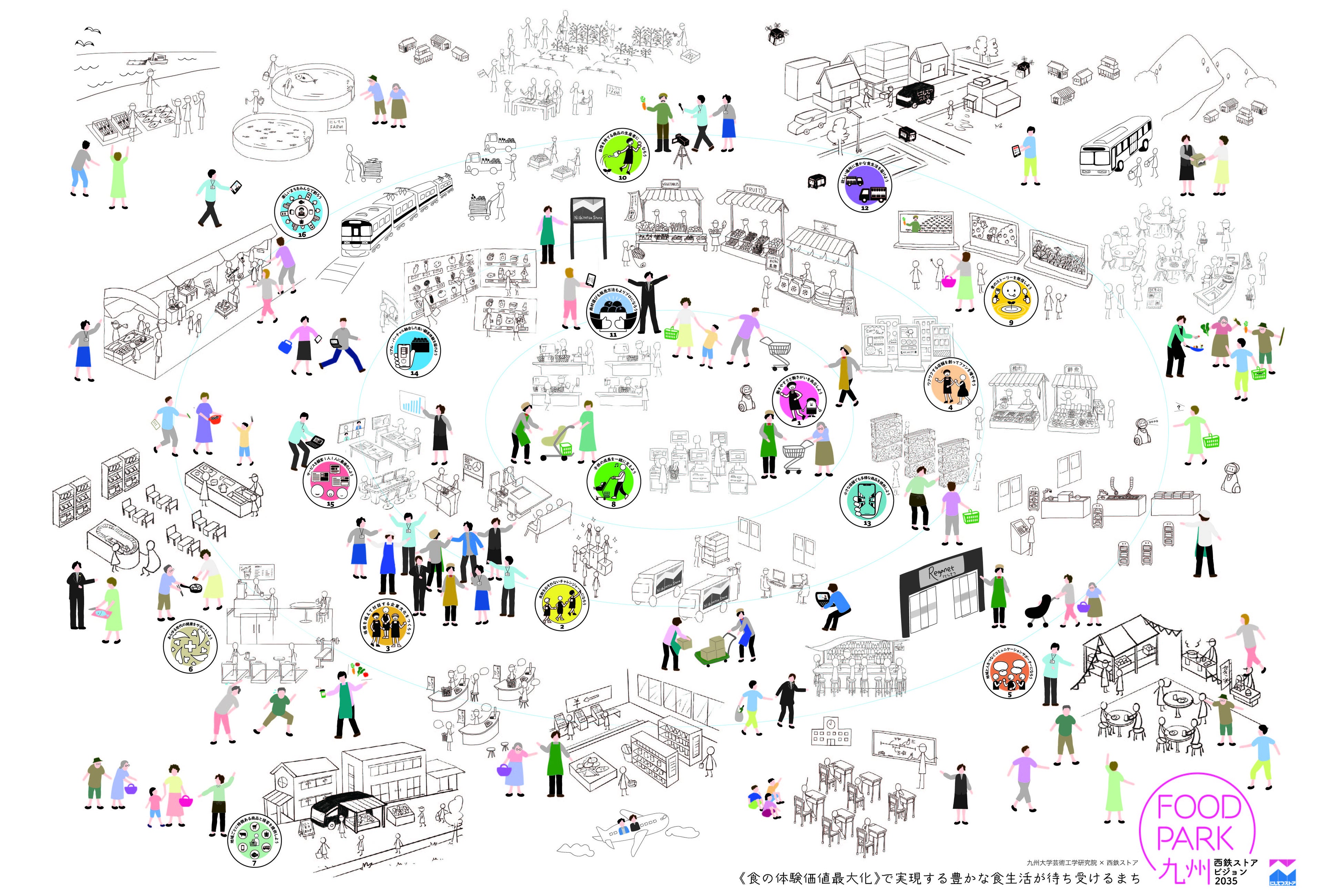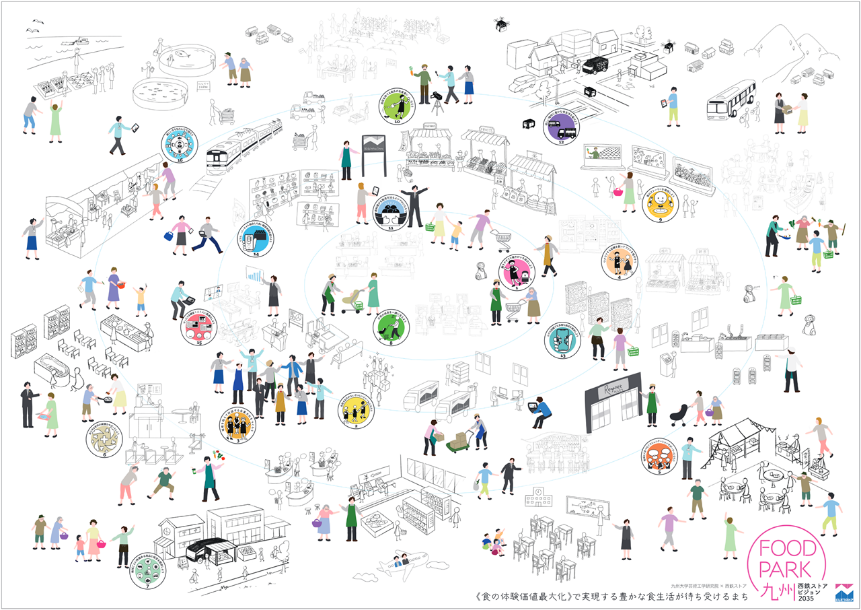 「西鉄ストアビジョン2035」の策定と同時に、九州大学大学院芸術工学研究院と共同研究を実施し、ビジュアルを制作いたしました。作成したビジュアルを通じてお客様、お取引先様などに広く知っていただくのはもちろん、地域とともに発展する企業であることを再認識したいと考えています。また、16の未来シーンを従業員一人一人が理解して自ら行動に移していくことが重要です。実行に移すという、ある種の風土改革に向けたツールの在り方を九州大学大学院芸術工学研究院と共に研究した成果でもあります。このビジュアルを使った社内ワークショップを通じて、社員一人一人が自ら行動できる社風を築いていけるよう取り組んでまいります。